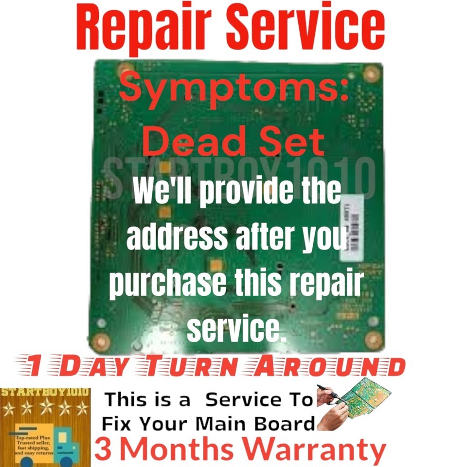 Service This sale is for a REBUILD SERVICE on your main board. You will have to send your part to us for repair. We will rebuild and mail the part back to you within 48 hours after receiving the part. We use USPS Priority Mail service which takes additional 2-3 business days for delivery. When you ship your board to us for repair, please let us know the tracking number from the receipt We don't repair burned boards, missing parts or If your board has been repaired or replaced parts . We have the same TV to test your board We will make sure your BOARD is in working condition and send back to you We have been in business for over 25 years to repair tv lcd dlp plasma. In most cases we can repair the defective board, however if your board can't be repaired, ( no repairing fee) ABOUT THE WARRANTY: UNLESS SPECIFIED OTHERWISE, ALL OF OUR PARTS ARE WARRANTIED FOR 30 DAYS. AGAINST REPEAT IDENTICAL FAILURE FROM THE DATE OF RETURN SHIPPING. THANKS FOR READING AND WE LOOK FORWARD TO DOING BUSINESS WITH YOU Track Page Views WithAuctiva's FREE Counter