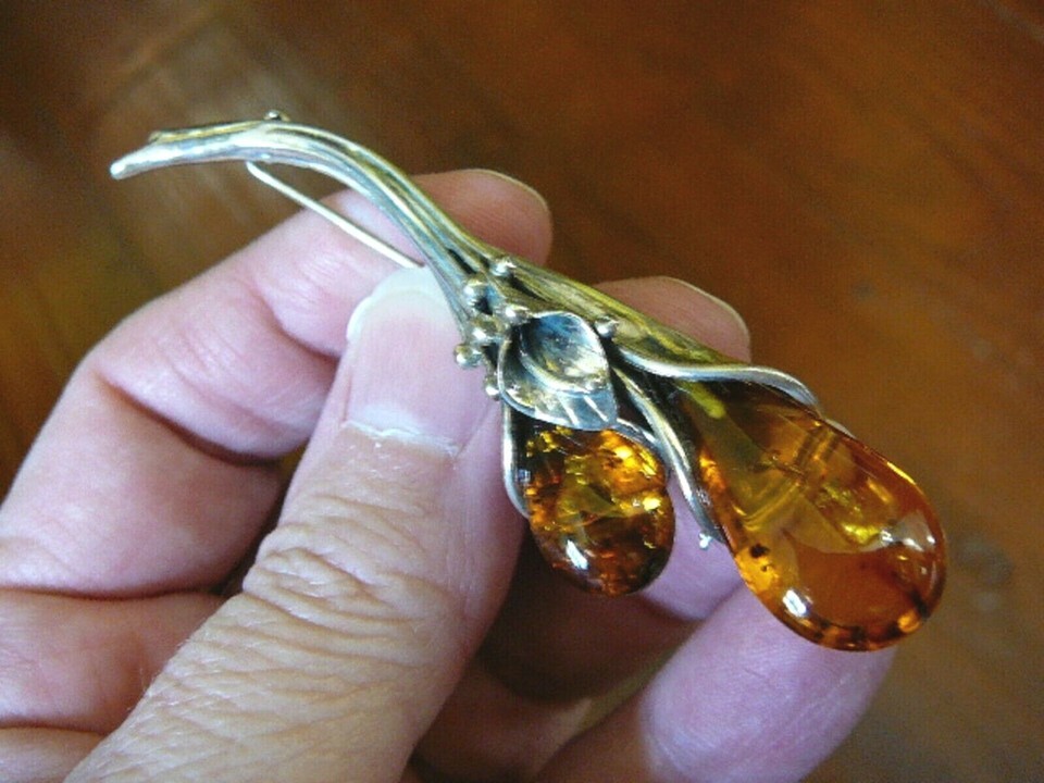 (pin64-14) Orange AMBER Calla Lily .925 Sterling SILVER brooch Poland Jewelry