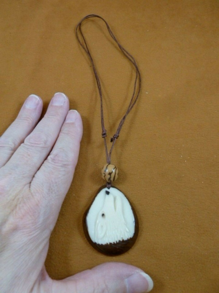 (#TNE-WOLF-773-B) Hand crafted tagua nut figurine of a HOWLING WOLF HEAD PENDANT/NECKLACE, Slice of tagua nut, bas relief figurine of wolf head, 1-3/4? long x 1-1/2? wide x 1/4? thick. Pendant is on 16? brown cotton cording, sliding knot adjustable to 28? long.