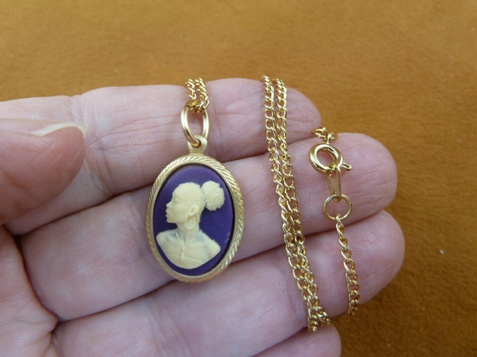 CA30-77 RARE African American LADY purple + white CAMEO brass Pendant necklace