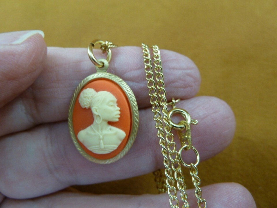 CA30-81 RARE African American LADY orange + white CAMEO brass Pendant necklace