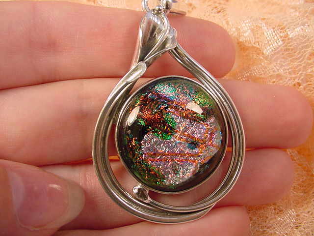 Dichroic glass is glass with precious metals such as gold, silver, copper, aluminum, titanium, and/or chromium etc. fused into it. It has a GEMSTONE status though manmade. Sterling silver mounting is custom made for us in Poland with the lily and grape leaf designs that are STUNNING. "Dichroic" means "two colors" and indeed when the pendant moves it changes color so it goes with EVERYTHING in your wardrobe.