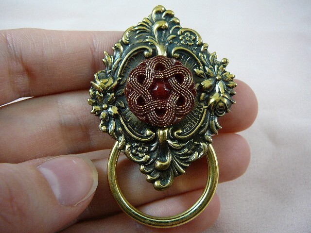 (Internal #E-698) This is a red with raised gold flower design 1940's glass Czech button on a piece of round brass with scrolled flower design, made into a pin/pendant brass eyeglass or ID badge holder, 2-1/4" long (includes loop). Clasp pin/pendant glued on back horizontally. Excellent detail and texture on the brass.
