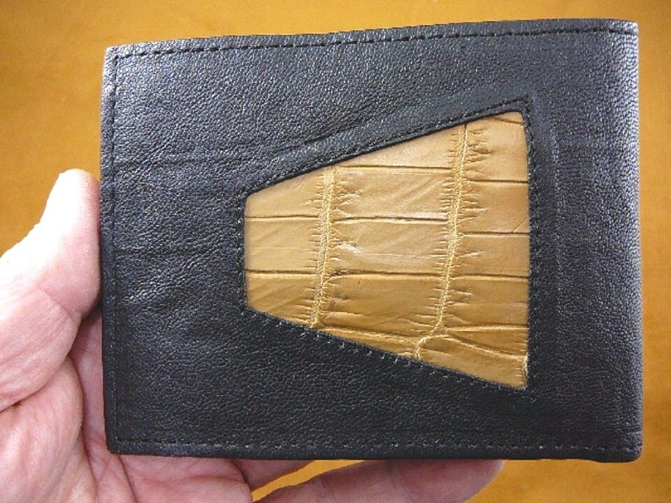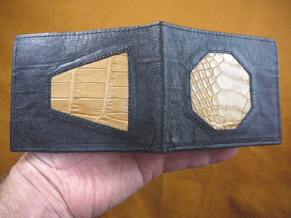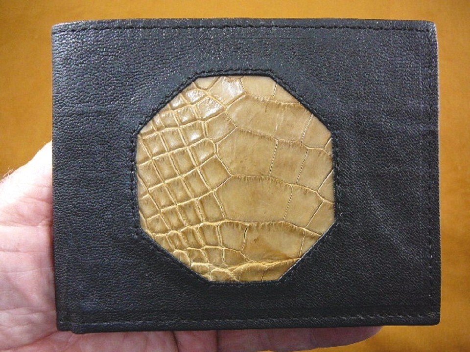 (Internal #EL200-37) New, genuine Caiman crocodile (Caiman latirostris) wallet with outer Caiman croc inserts front back, rest is calf hide; inside calf hide; open length 9" long x 3-5/8" wide.