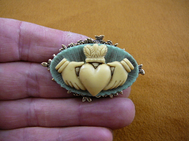 (internal #CM38-77) You are bidding on a lovely cameo of an IRISH CLADDAGH (two hands holding between them, or presenting, a HEART. Over the heart is a crown or fleur-de-lis. The symbols mean Let Love and Friendship Reign. The original expression is: "With These Hands I Give you my Heart and Crown it with my Love"). Cameo itself measures 1-3/4" wide x 1" long; new, organic pine resin cameo has been hand molded from the shell original in OFF-WHITE color with MEDIUM BLUE background color, antiqued, then mounted on - - brass with flower design; clasp pin/pendant glued horizontally on back. This is exactly the cameo you would receive.