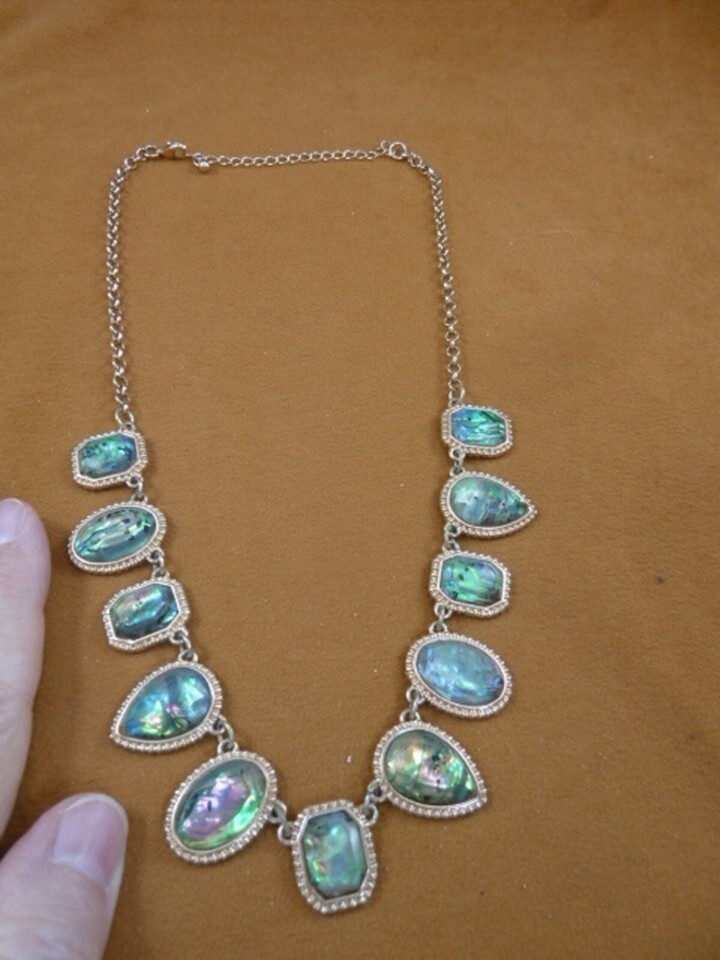 (Internal #VN-18) You are bidding on a beautiful, unusual paua shell lookalike glass faceted stone necklace. Two shapes: Faceted rectangular 14x11 mm and teardrop 19x13 mm; gold color chain with lobster claw closure, 22" long.