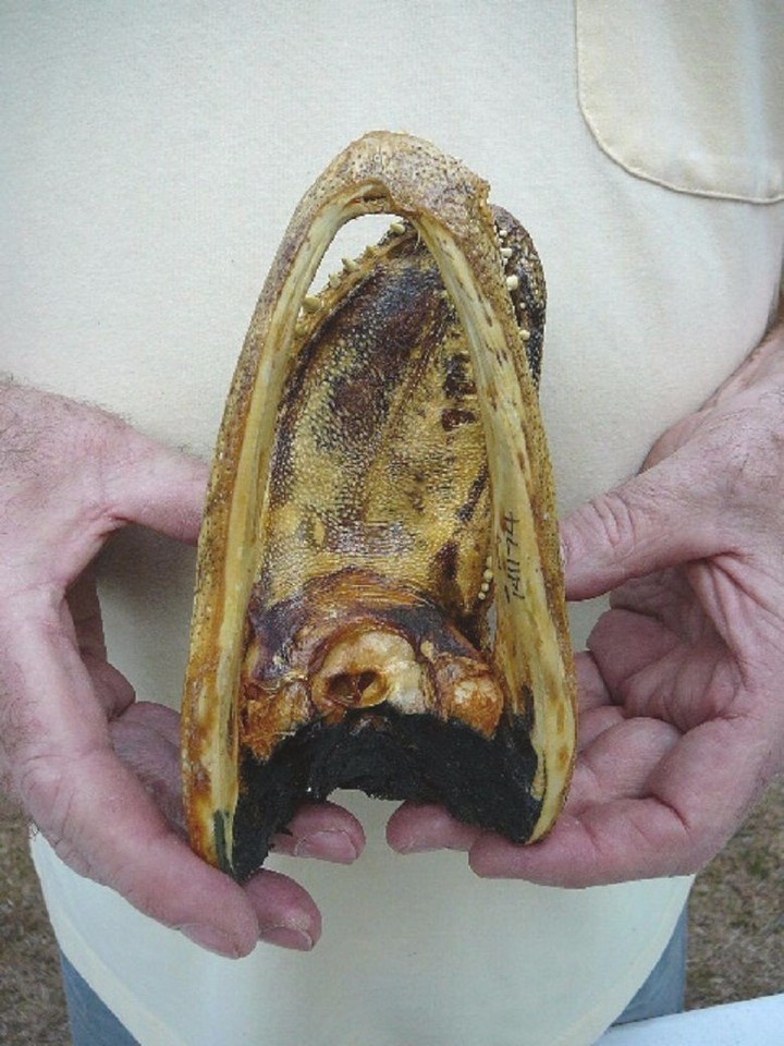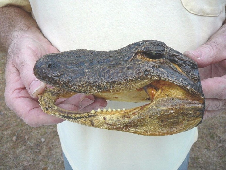 Glenn began to notice these deformed heads as part of his orders for gator heads from Louisiana, and began to request them to set aside the deformed heads to send to him, which they did! That is how we acquired so many, realizing how large a problem the pollution really was.