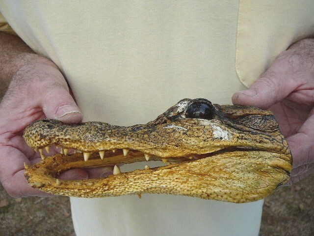 AWESOME collectible! No flaws. You can check on the net all you want, you won't find gator heads this large available. Wild gators have been harvested for 200 years, either live from government regulated hunts during the month of September in Louisiana, specific permits issued for rogue gators, or from legal egg collection by Alligator Farms from which gators are raised and a percentage released back to the wild.