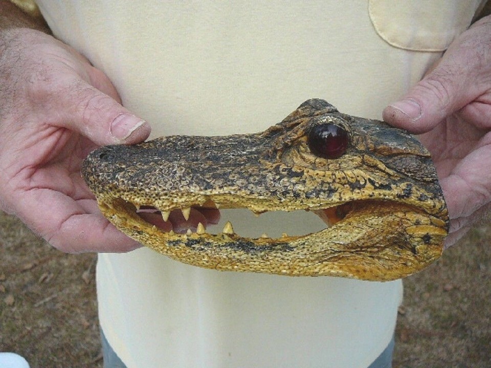AWESOME collectible! No flaws. You can check on the net all you want, you won't find gator heads this large available. Wild gators have been harvested for 200 years, either live from government regulated hunts during the month of September in Louisiana, specific permits issued for rogue gators, or from legal egg collection by Alligator Farms from which gators are raised and a percentage released back to the wild.