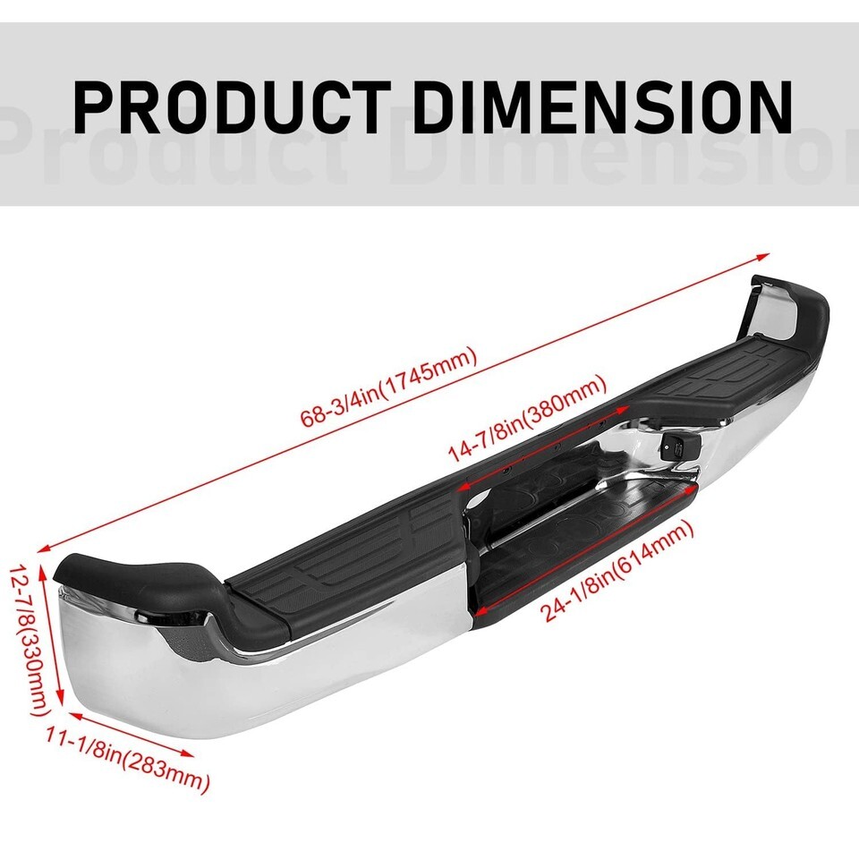 Description: Rear step bumper made from high quality steel, surface electrophoresis treatment for strength and durability. Heavy duty steel with pp plastic construction ensure the vehicle is protected against damage from road debris and impacts