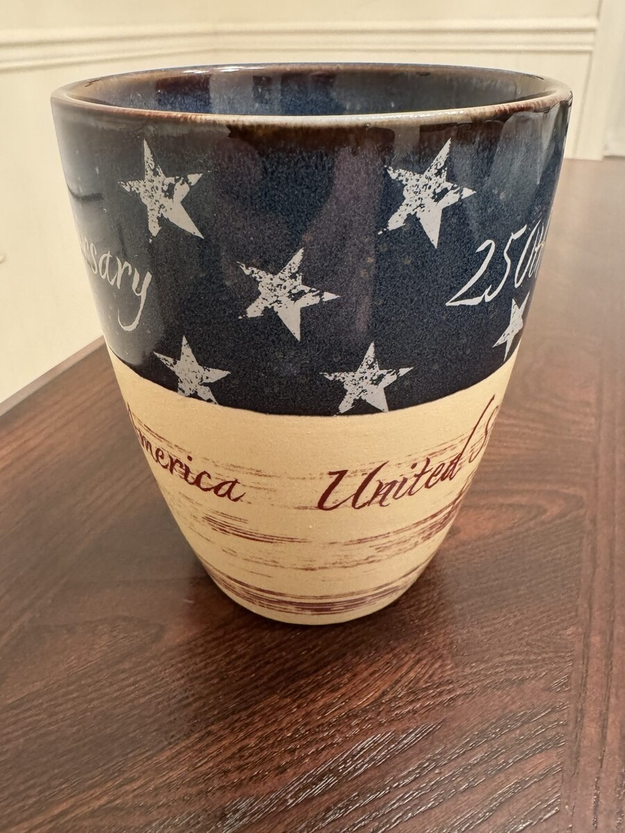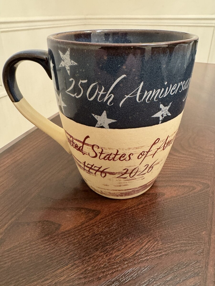 Raise a toast to history with this limited-edition 250th Anniversary Mug, a tribute to the enduring legacy of the United States. Featuring a striking two-tone design, the upper half evokes the star-spangled banner with deep navy and white stars, while the lower half warms the hand with heritage beige and flowing red script.