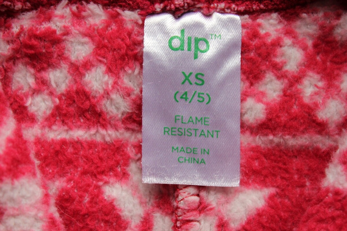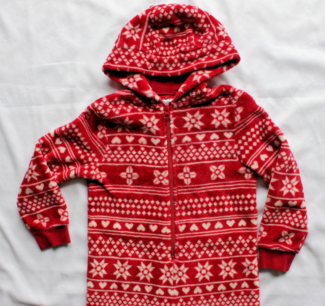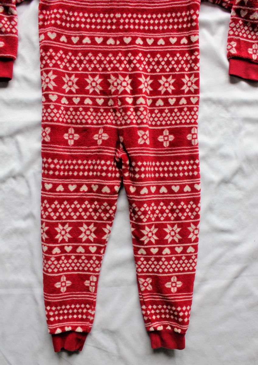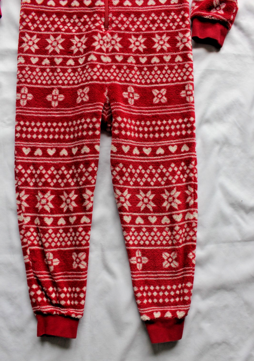 This product is a cozy one-piece hooded pajama in size X-Small, perfect for kids ages 4 to 5. Made of 100% polyester fleece, it features a red and white all-over pattern, making it ideal for the holiday season. The pajama has a zip closure, long sleeves, and a hood for added warmth. With a pit to pit measurement of 14 inches and an inseam of 18 inches, this comfortable garment is machine washable and suitable for the winter and fall seasons.