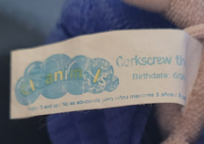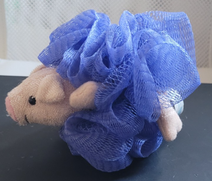 This pig loofa is in good used condition. I can't be 100% sure it has been used, but the appearance of the tag shows wear possibly from water. I believe the birthdate on the tag is 6-30-9?. There are no holes or stains that I found.