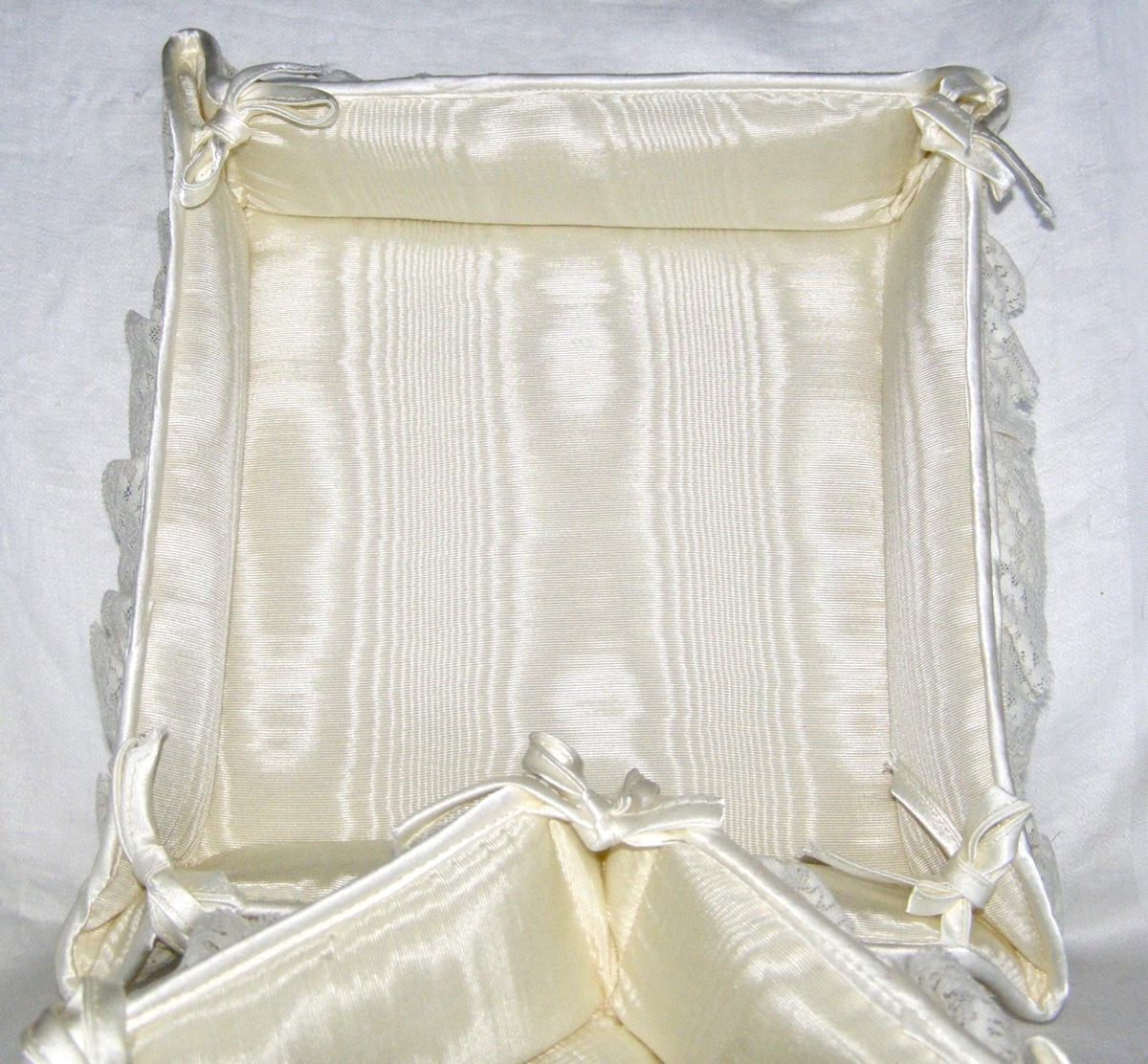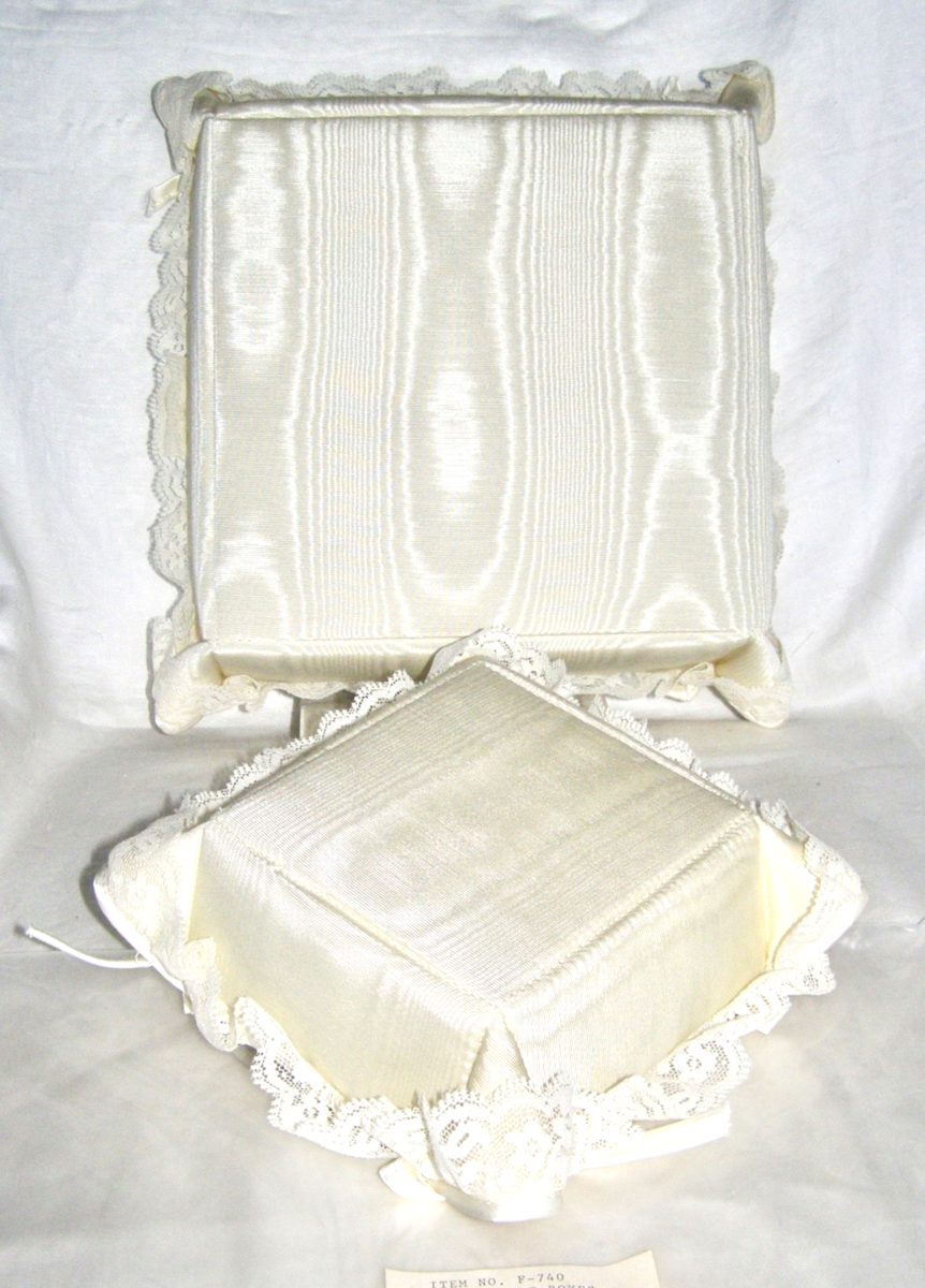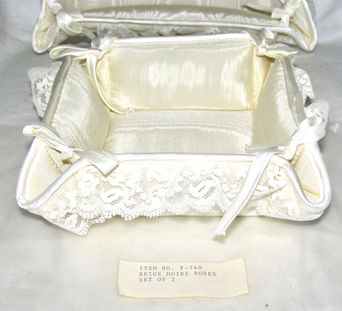 SET OF 2 MOIRE FABRIC AND LACE TRIMMED IVORY COLORED OPEN BOXES |