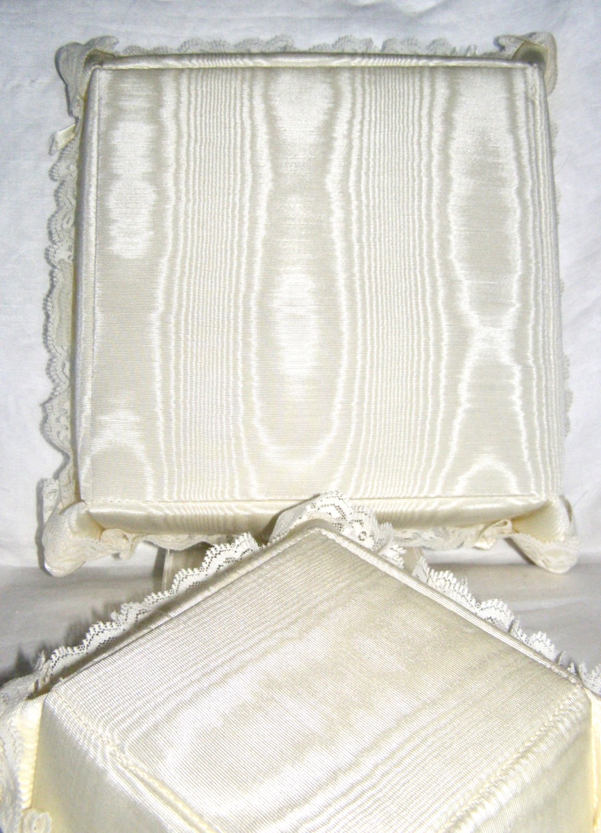 VINT. SET OF 2 MOIRE FABRIC w/ LACE TRIMMED IVORY COLORED OPEN TRAY PADDED BOXES