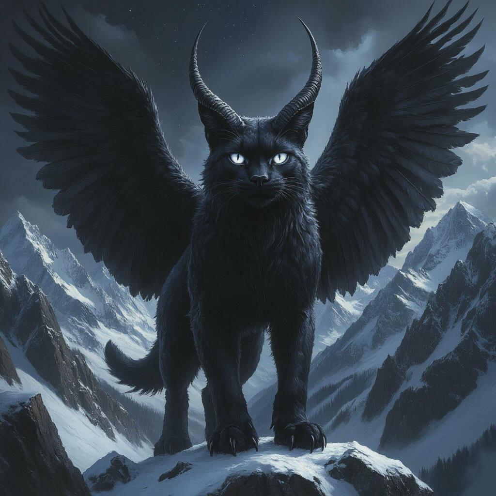 Sleek. Fierce. Enigmatic. She is no ordinary feline—she is a serval born of shadows and starlight, her spotted coat ink-black, her massive wings stretching like midnight across the sky. Both predator and protector, she moves with an elegance that blends wild savagery and divine grace.