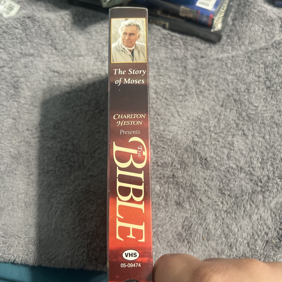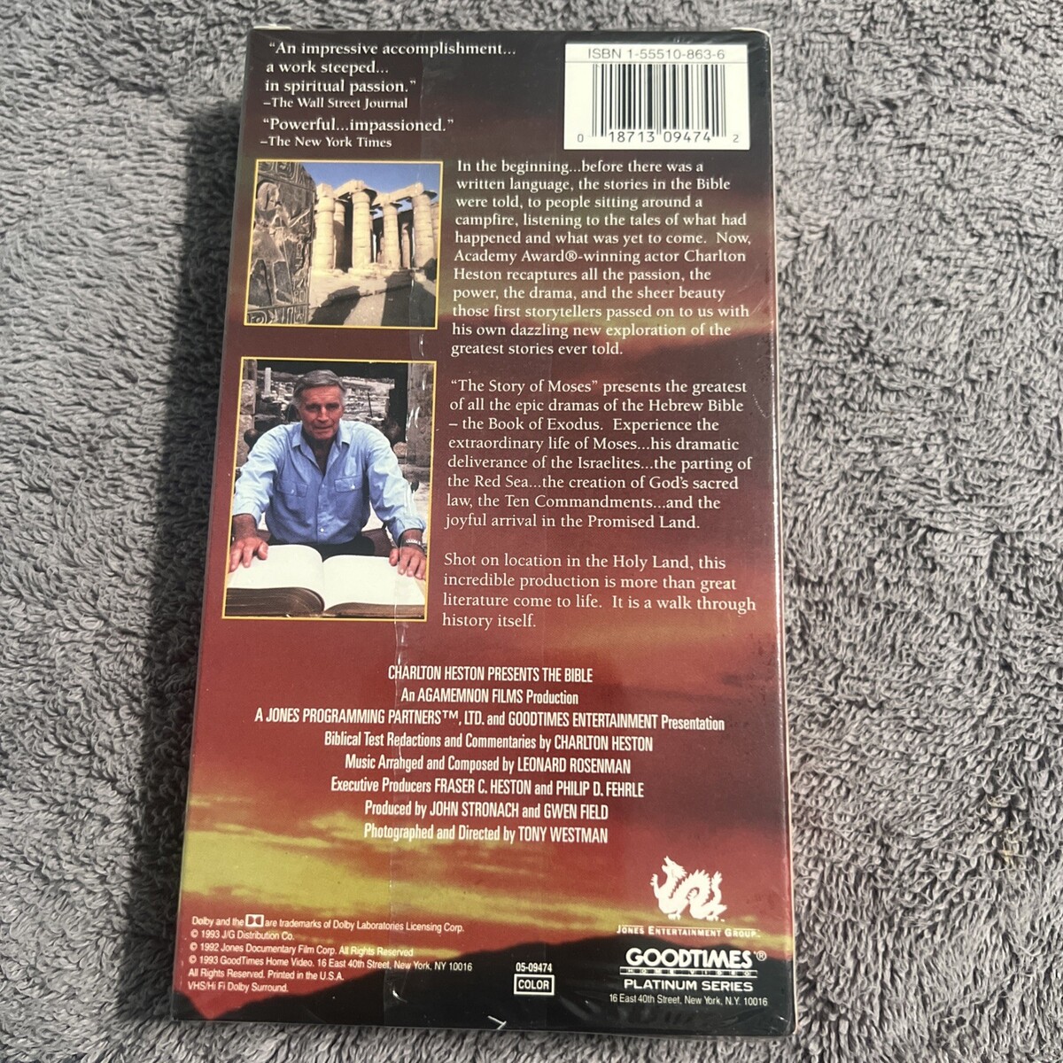 The product is a new sealed VHS tape titled "The Bible - The Story of Moses" presented by Charlton Heston. This documentary film is in English language and follows the historical and religious narrative of Moses. Produced by Goodtimes Video in the United States, the VHS tape is in NTSC signal standard and is not a former rental, making it a valuable addition to any collection of religious and historical documentaries.