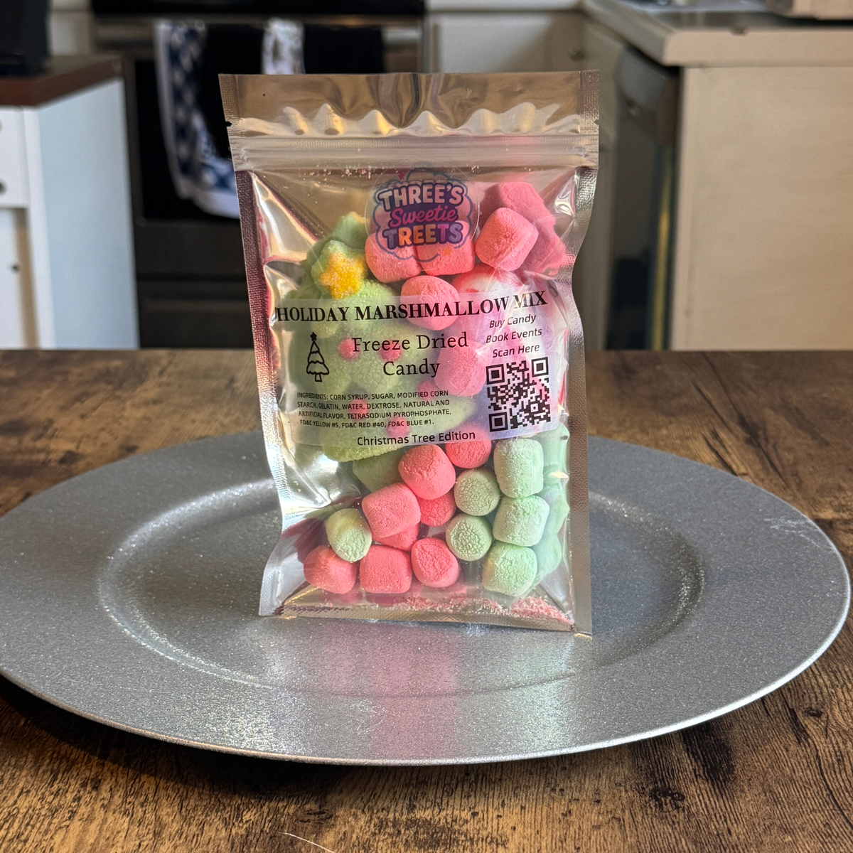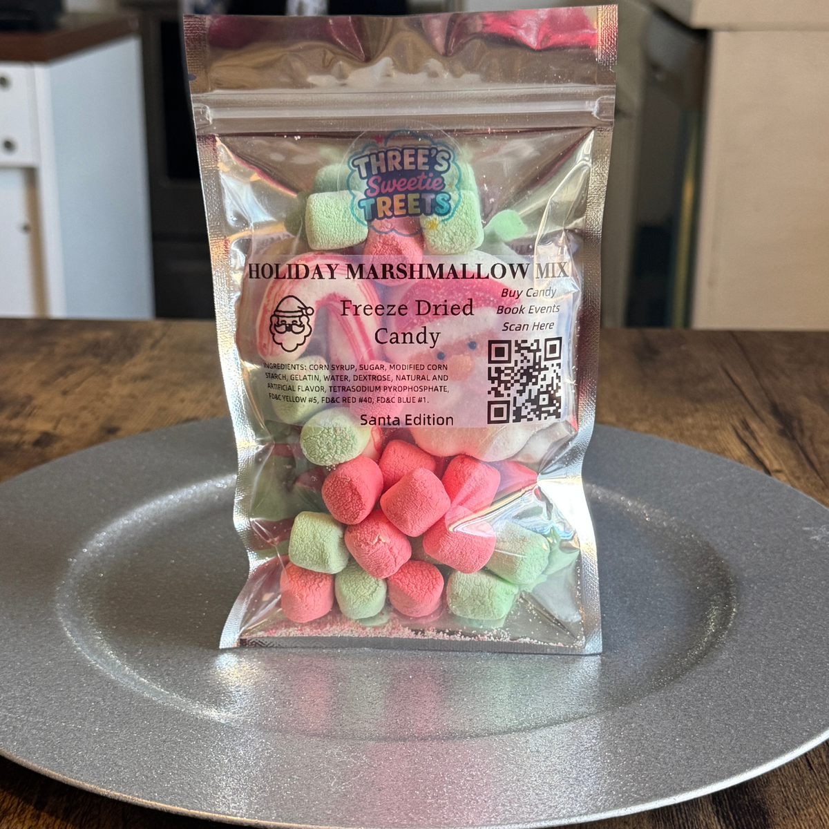 Feel the Christmas spirit with our Freeze-Dried Holiday Marshmallow Mix from Three’s Sweetie Treets. Each bag features fluffy mini marshmallows and crisp peppermint candy cane pieces for a sweet, cool holiday crunch. Every bag includes one festive freeze-dried shape — a Christmas Tree, Santa, or Gingerbread Man — making each mix a fun seasonal surprise. Simply add hot cocoa or enjoy straight from the bag for a cozy, cheerful treat.