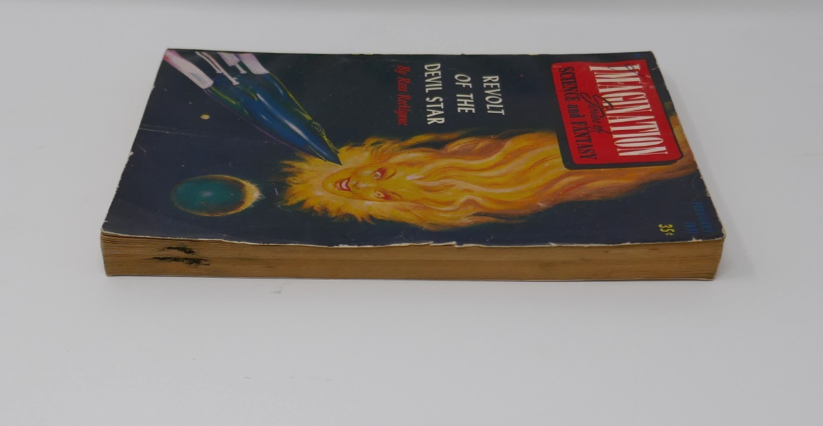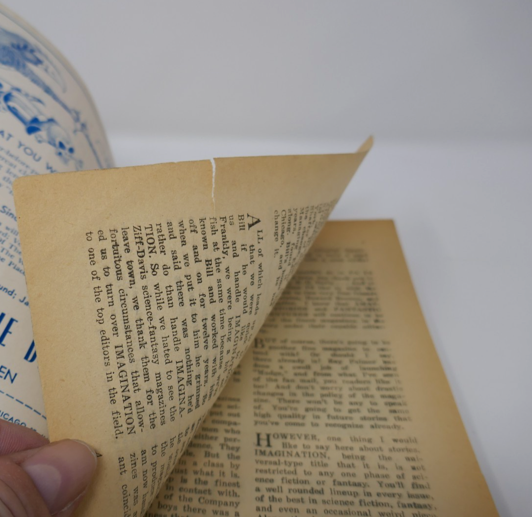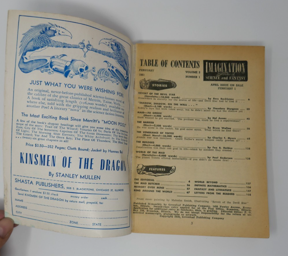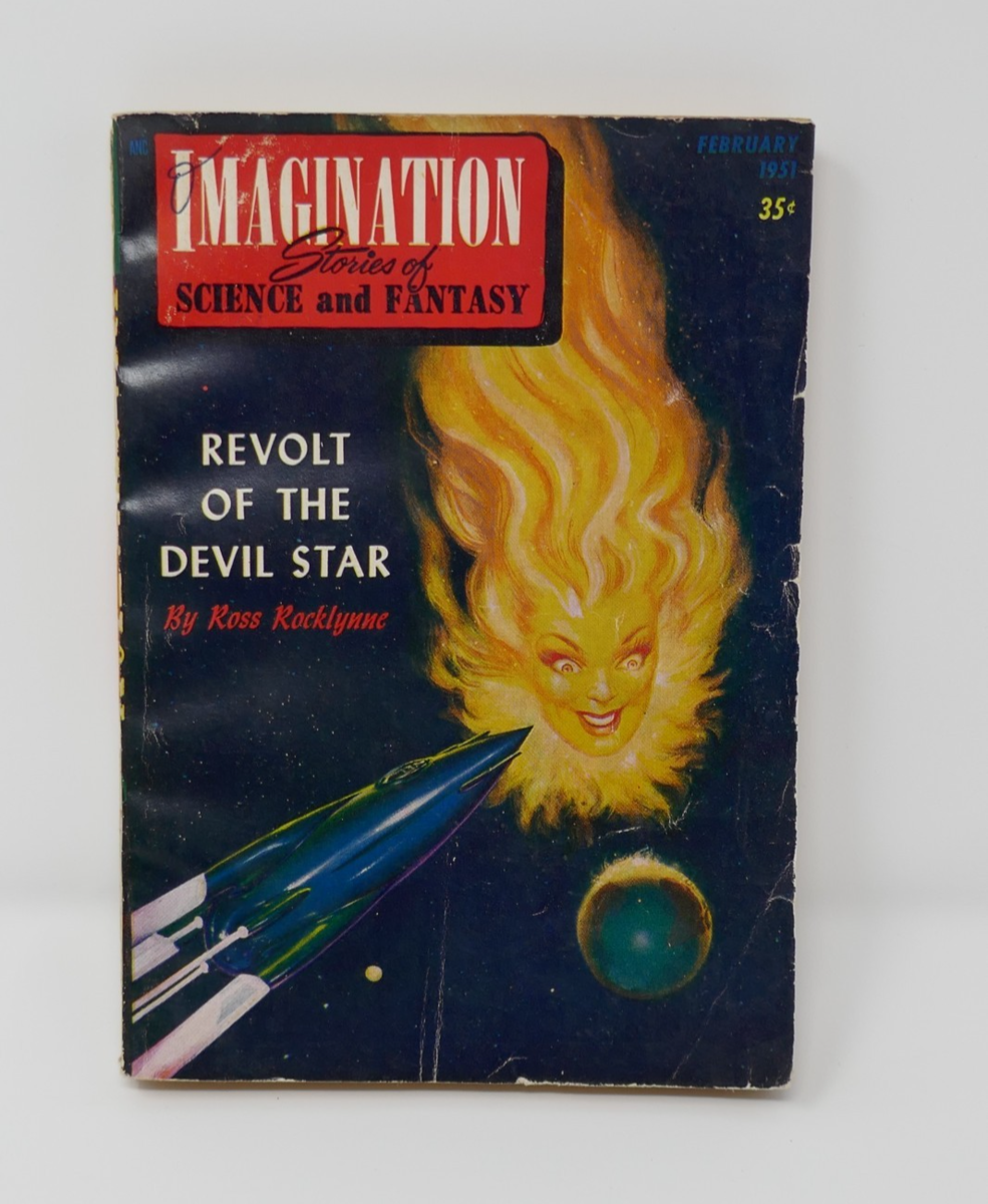 This is a vintage collectible magazine titled "Imagination Stories of Science and Fantasy" dated February 1951. The covers have wear and pages have some yellowing. This magazine focuses on science fiction and fantasy stories, offering readers a unique blend of imaginative and futuristic narratives. It serves as a valuable addition to any collection for fans of classic science fiction and fantasy literature from the mid-20th century.