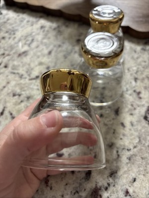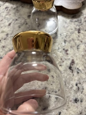 The MCM Anchor Hocking Rocks Glasses are a set of 6 vintage cocktail glasses with a unique 22k gold bottom, perfect for all occasions. Handmade in America in the 1960s by Anchor Hocking, these elegant glass cups feature a mid-century modern style with a gold gilt pattern. The glass is hand-blown and weighted, showcasing the craftsmanship and quality of the vintage pieces. With a clear and gold color scheme, these cocktail glasses are a stylish addition to any home bar or dining table. THREE OF THE CUPS DO HAVE SOME DAMAGED AREAS ON THE GOLD .SEE PHOTOS.