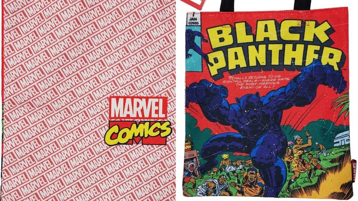 This is a Marvel Black Panther Retro Comic Book Tote Bag featuring the cover art from Black Panther Issue #7, originally published in January 1977. The text on the bag reads "T'CHALLA RETURNS TO HIS RIGHTFUL REALM WHERE WAITS THE MOST INSIDIOUS ENEMY OF ALL!".
