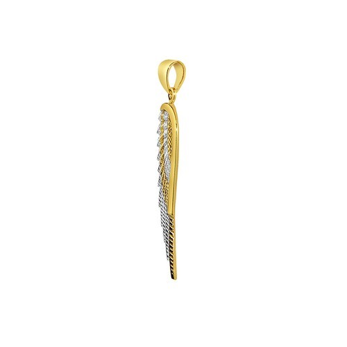 This 14k two-tone gold angel pendant, measuring 1.33 inches in length, serves as a meaningful reminder of one's guardian angel. Crafted with precision from 14-karat yellow and white gold, the pendant showcases intricate details that make it a cherished piece for both men and women. The pendant has a notable width of 9.3 mm and a length of 30.8 mm, with a total weight of approximately 1.8 grams. Ideal as a gift for loved ones or as a personal keepsake, this religious jewelry captures the essence of protection and love. The combination of yellow and white gold lends it an elegant appeal, suitable for various occasions. Each pendant is crafted with care, and while weights and measurements are provided, slight variations may occur. This piece not only adds a touch of style but also carries a sentimental significance, making it a timeless addition to any jewelry collection.