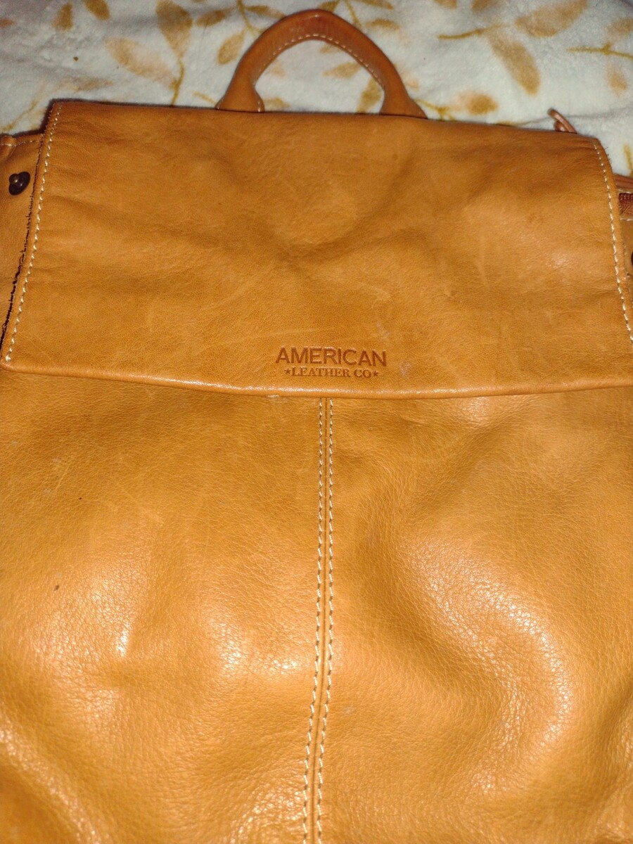 The American Leather Co Backpack in Tan Leather is a medium-sized rectangular backpack designed for women. Crafted from leather with a fabric lining, this stylish backpack features a solid camel exterior color with gold hardware accents. The adjustable brown leather strap adds to the functionality and versatility of this fashionable accessory. Perfect for everyday use, this backpack combines both practicality and classic design elements.