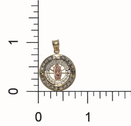 The 14k Two-tone Gold 0.98" Cubic Zirconia Nuestra Boda Virgin Mary Pendant is a beautifully designed piece suitable for both men and women. Crafted from genuine 14-karat yellow and rose gold, this pendant showcases a round-cut cubic zirconia that enhances its elegant appearance. The centerpiece features a Greek-key pattern with 'Nuestra Boda' intricately etched above the rose gold depiction of the Virgin Mary.