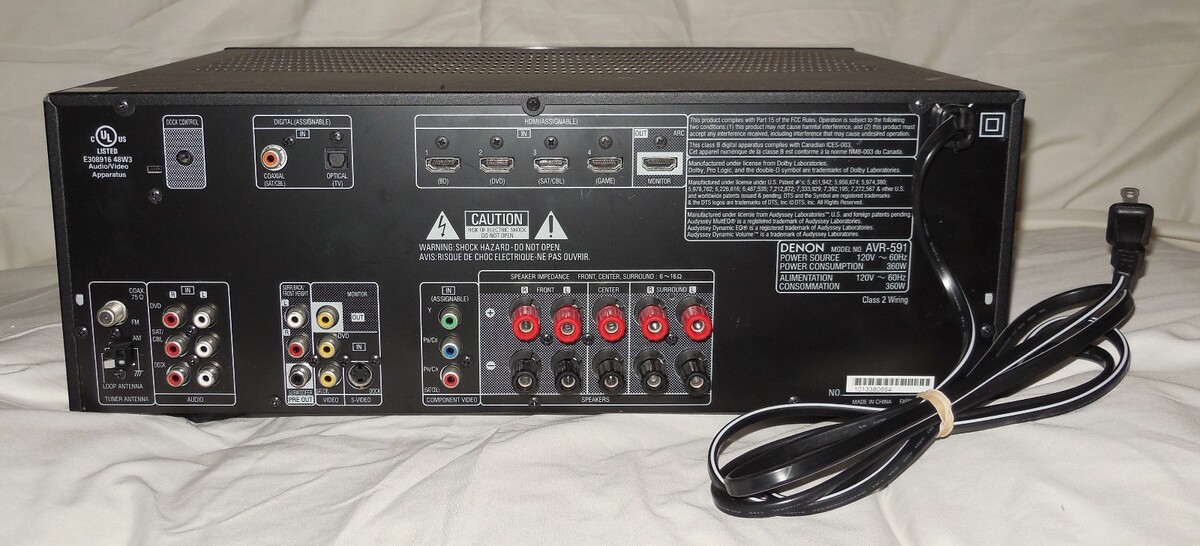 For Sale is a Used but in good Condition Denon AVR-591 5.1 Channel Home Theater Receiver With HDMI 1.4A Black 8409 Front Knob is missing as can be seen in the pictures provided (still works).. Does NOT include a Remote But will include an HDMI or RCA Red Yellow White Audio Video Cables. This item will be double boxed for Added protection in transport this is why shipping may seem high especially if you do not live in Florida. Box will be at least 24x24x12 and is at least 25lbs. Please Note this ships via UPS and Must have a Street address if you have a PO Box you must select USPS shipping or the transaction will be canceled. Please see photos for more details. Please ask any and all questions prior to purchasing. Fast same or next day shipping with delivery confirmation within the U.S. NOTE: SORRY BUT DO TO THE WEIGHT OF THE ITEM and SIZE OF THE BOX THIS ITEM ONLY SHIPS TO CUSTOMERS WITHIN THE UNITED STATES