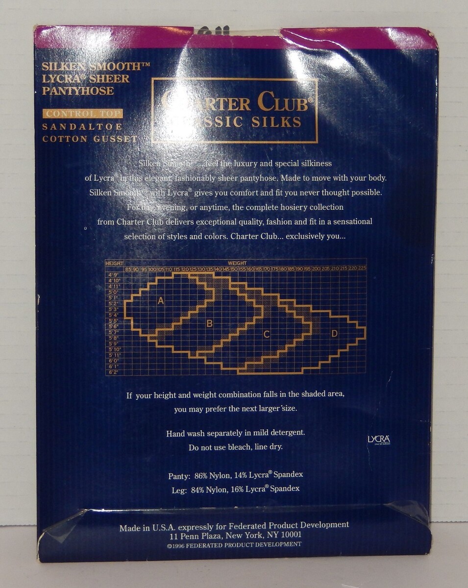 For Sale is a Vintage Charter Club Classic Silks Pantyhose Size B Control Top Style 2510 White Stockings. its In good Condition as pictured. Please ask Any and All Questions prior to purchasing. Fast Same or Next day shipping with Free Delivery Confirmation within the U.S. Payment Due within 7 days of purchase (if you need more time please let us know In advance) we love to combine shipping is always a Yes and Most of the time Additional Items Ship for free.