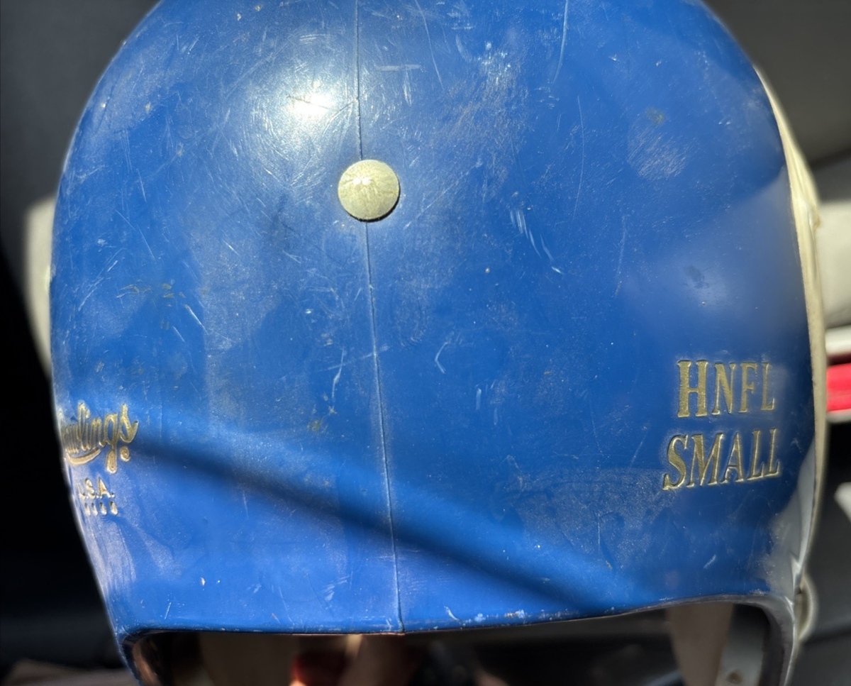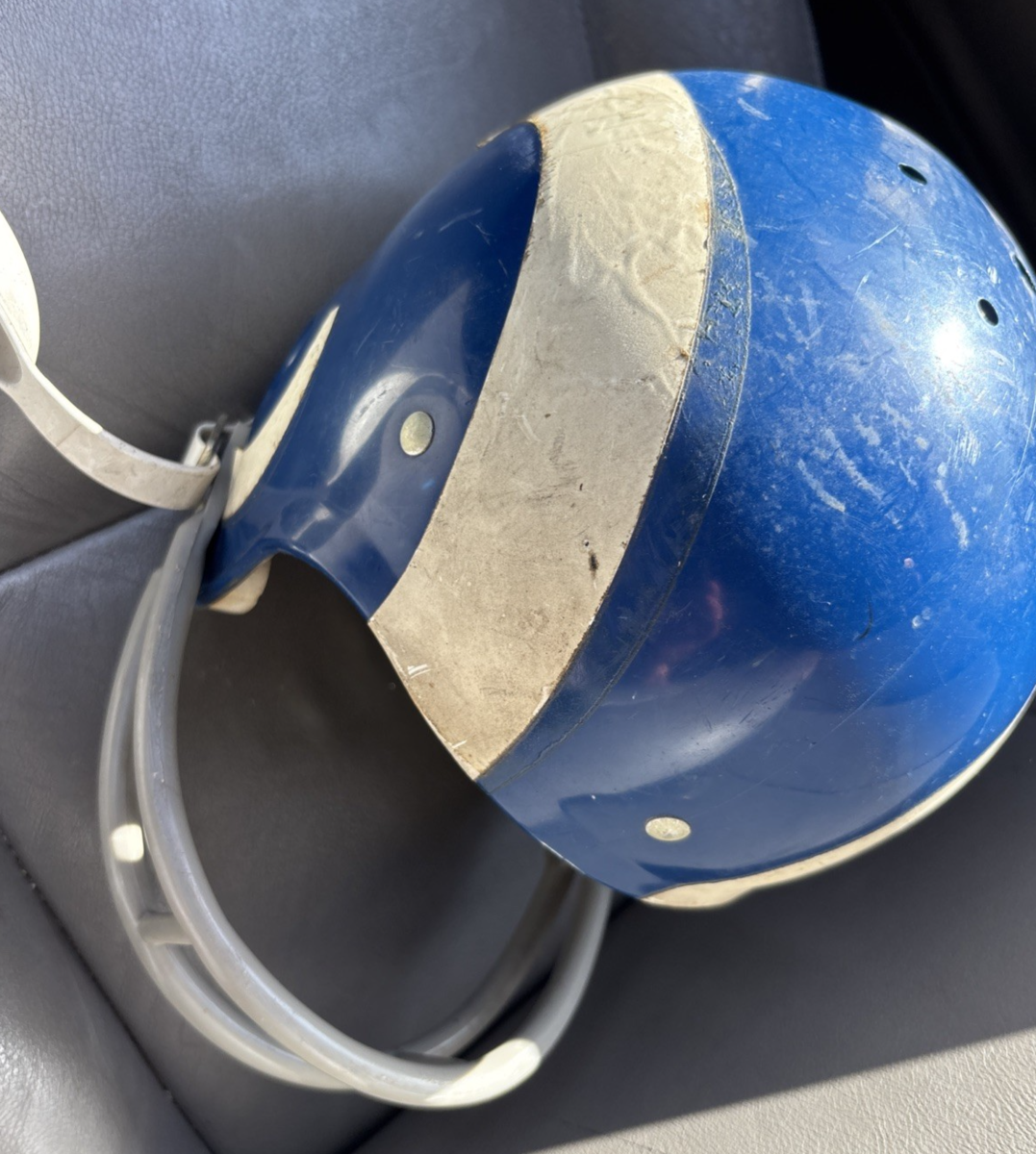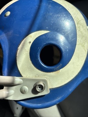 The product is a vintage 1970s Los Angeles Rams Rawlings football helmet, officially licensed by the National Football League (NFL). This helmet is designed for youth size small fans of the Los Angeles Rams, featuring the classic blue color and 2-bar design. Made in the United States, this helmet is a must-have for any fan of the team and the sport of football. Perfect for wearing during game days or displaying as a collectible piece of fan apparel and souvenirs.