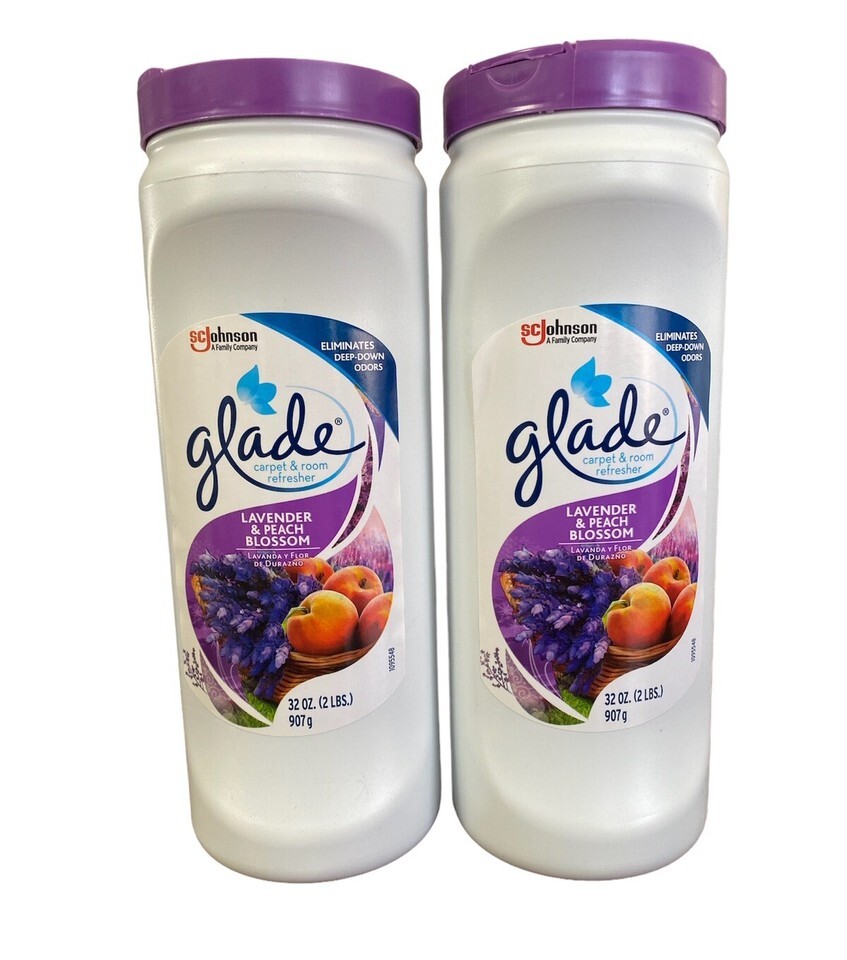 Freshen up your home with TWO bottles of Glade Carpet Room Refresher in Lavender Peach Blossom scent. Each bottle weighs 32 oz. and comes in a bundle of two. This odor eliminator is perfect for any home and can be used on carpets and in rooms.