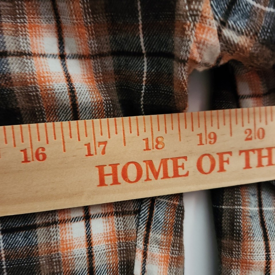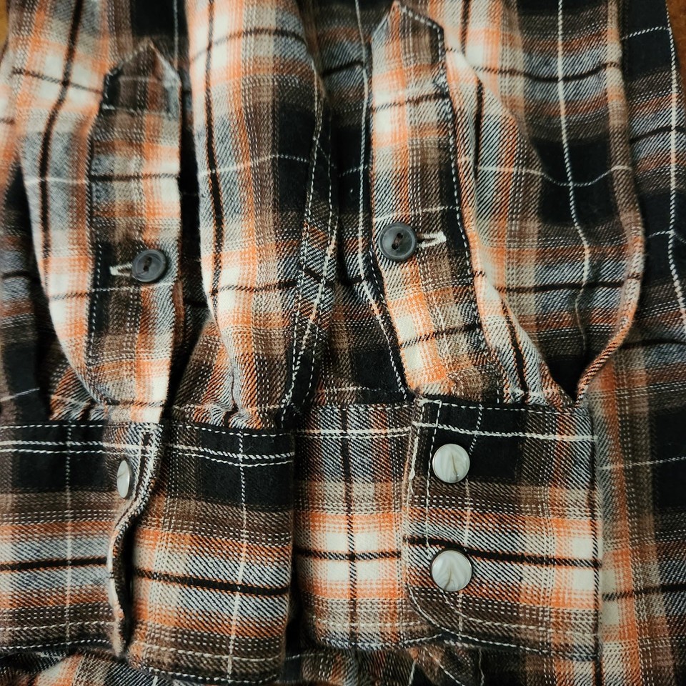 Preowned, good condition, Outdoor Life Men Clothing orange black plaid long sleeve shirt with buttons and snaps.