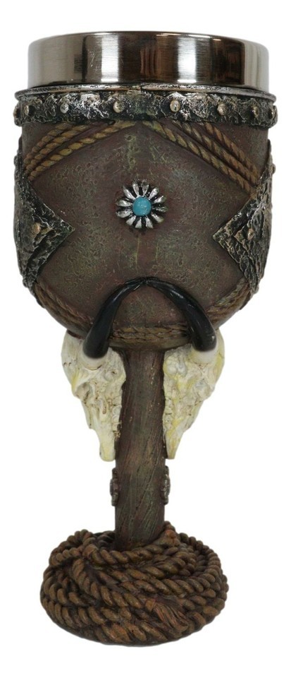 ? This Western Bison Skull Cowboy Wine Goblet is made of high quality resin with stainless steel liner, individually hand painted and polished. Color Tone May vary from pictures. Handwash only, applying soap to the stainless steel liner cup but using warm water/very mild soap on the resin housing.