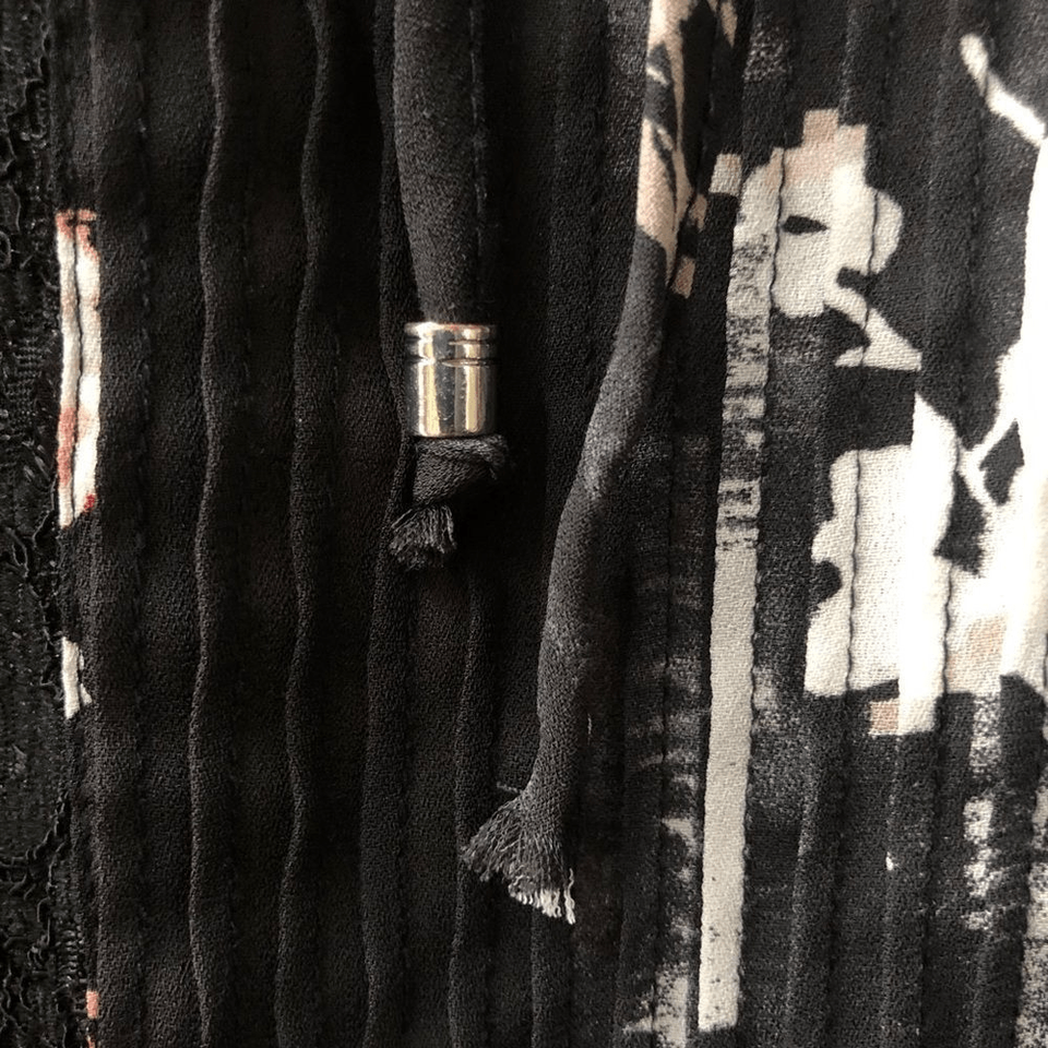 WHBM black lightweight tunic blouse with floral print, micro pleat placket and lace trim. Keyhole tie closure. The ties have a silver tab cap- one is missing. Full sleeve. Measurements are approximate and taken while laying flat: 26 inches from shoulder to hem and 19 inches from armpit to armpit.