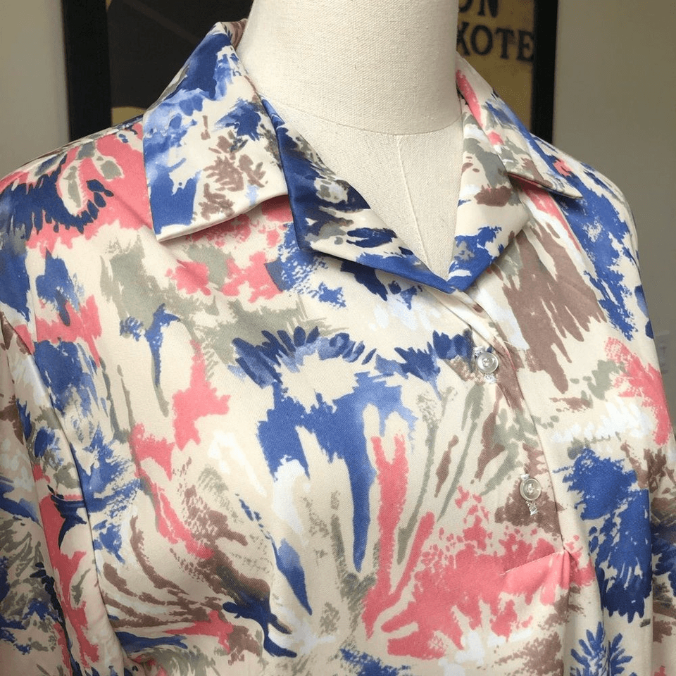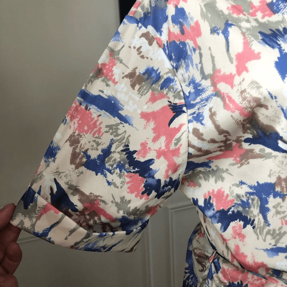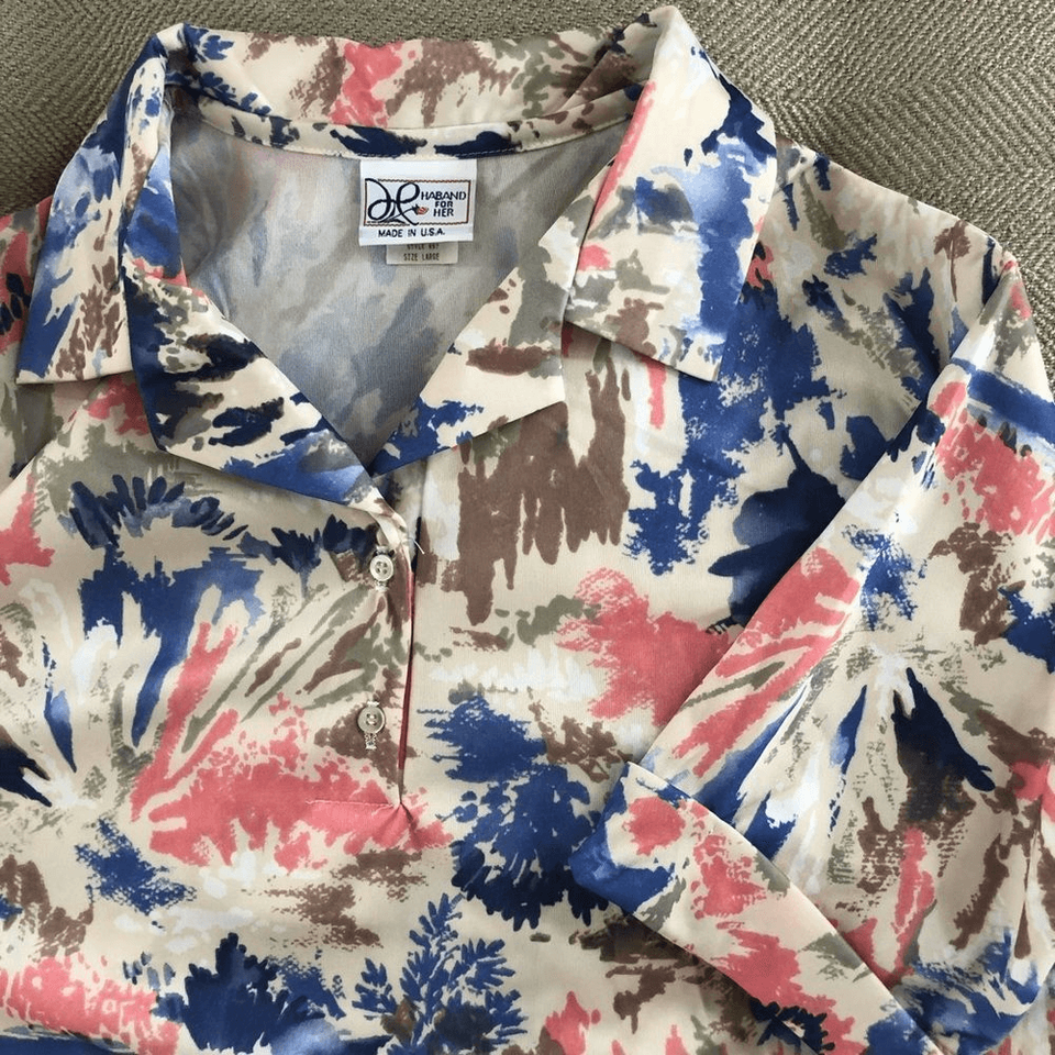 Vintage late 70s early 80s Haband For Her 100% polyester tunic top with tie waist and cuffed short sleeves. Brushstroke pattern. Laying flat measures approximately 27 inches from shoulder to hem and 22? armpit to armpit. Spread collar with 2 button placket.