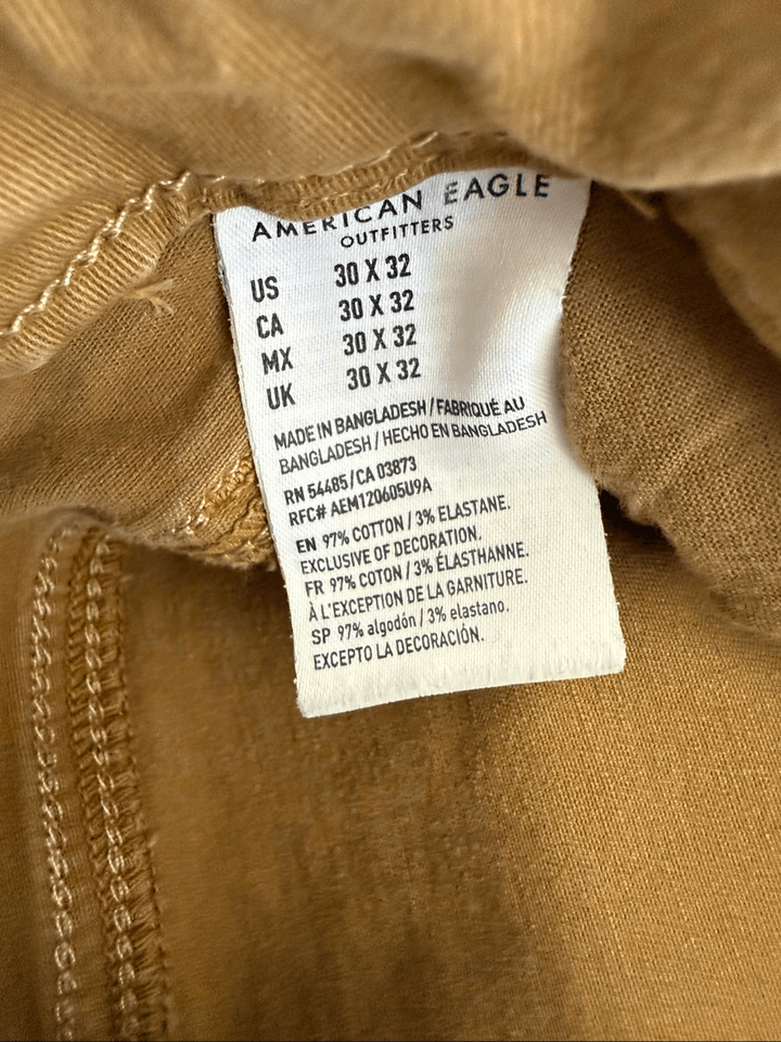 American Eagle outfitters men?s khaki color pants that have traditional, five pocket styling of jeans. Cotton and elastane blend. Text ice 30 x 32, however, the inseam after laundering measures 30 inches which is consistent with our experience with this brand