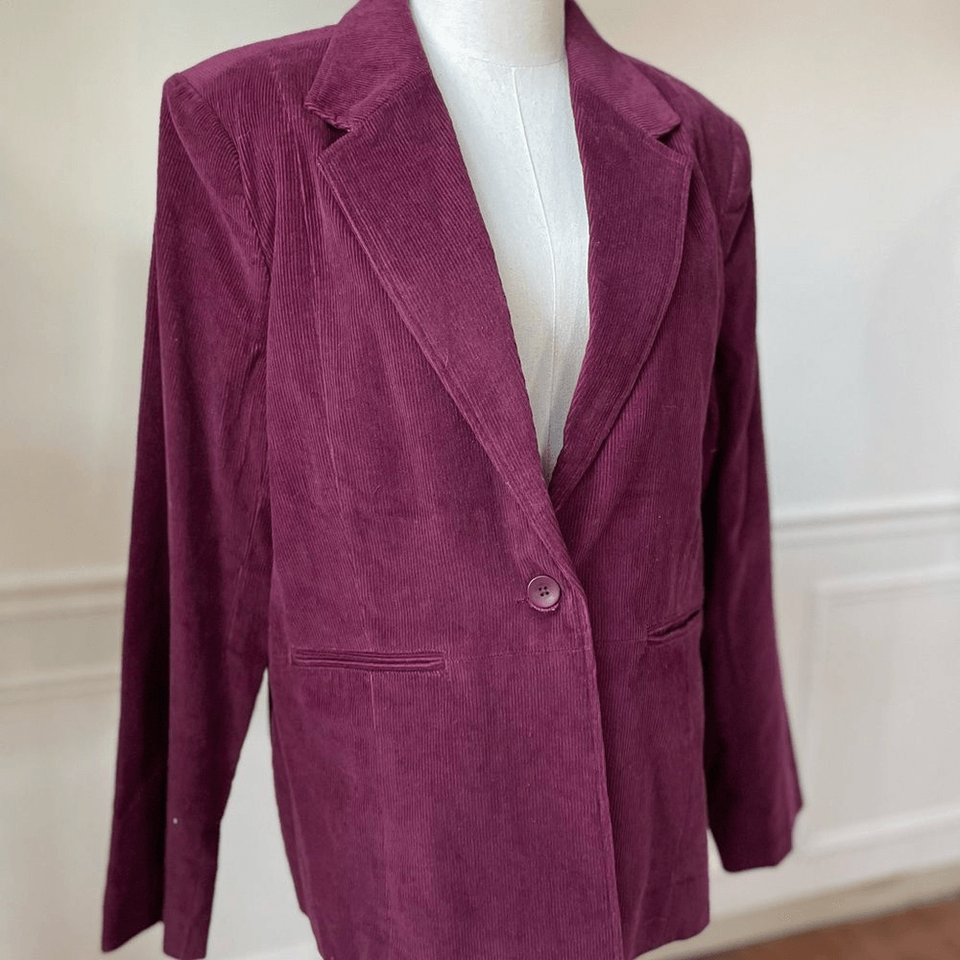 New with tags from QVC, Denim Co Merlot or burgundy shade single button corduroy blazer. 100% cotton corduroy lined with 100% polyester. Measurements are approximate and taken while laying flat: 27 inches shoulder to hem and 23 inches armpit to armpit