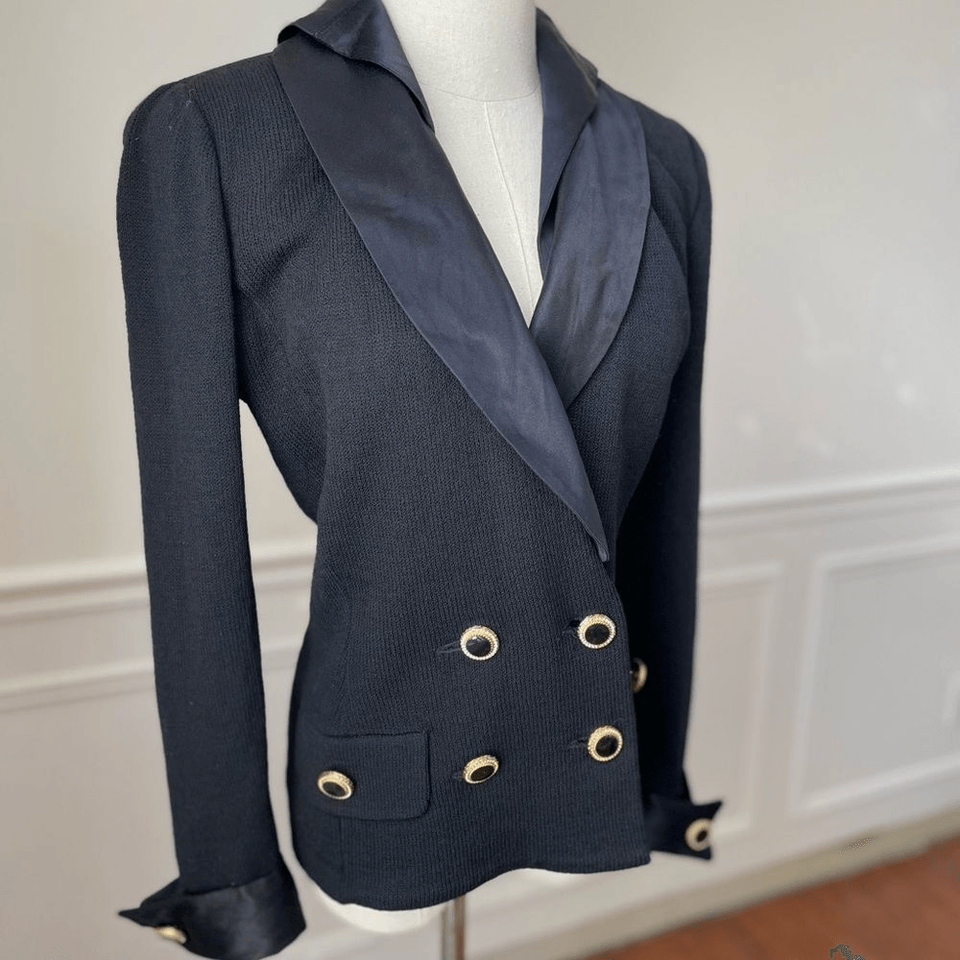 St John adjustable Santana knit double breasted sweater jacket cardigan with removable black satin collar and cuffs. Accentuated by beautiful gold buttons with black center and tiny rhinestone chips. The cuff buttons are actually cufflinks. The cuffs and collar button into the sweater. Measures approximately 24? shoulder to hem and 18.5? armpit to armpit. Some of the rhinestone chips are missing- one button is missing 4, another isn?t missing any. It?s not super noticeable because they are so small, shiny and reflective.