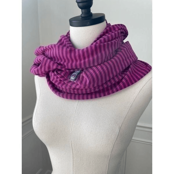 Lululemon Vinyasa Scarf in Rizzy Stripe Regal Plum Hero Blue Rulu material. Snaps closed so it can be worn as an infinity or long. When snapped it is 28 inches wide and 27 inches tall. Unsnapped it is 56 inches wide.
