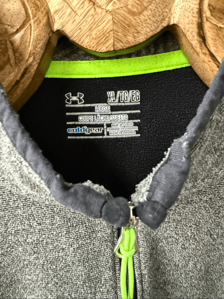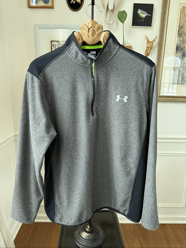 Men?s under Armour cold gear quarter zip pullover in gray Heather with solid black panel accents. Under Armour logo at the chest and neon zipper pull. Laying flat measures 29 inches shoulder to hem and 24 inches armpits to armpit. Tag size XL.