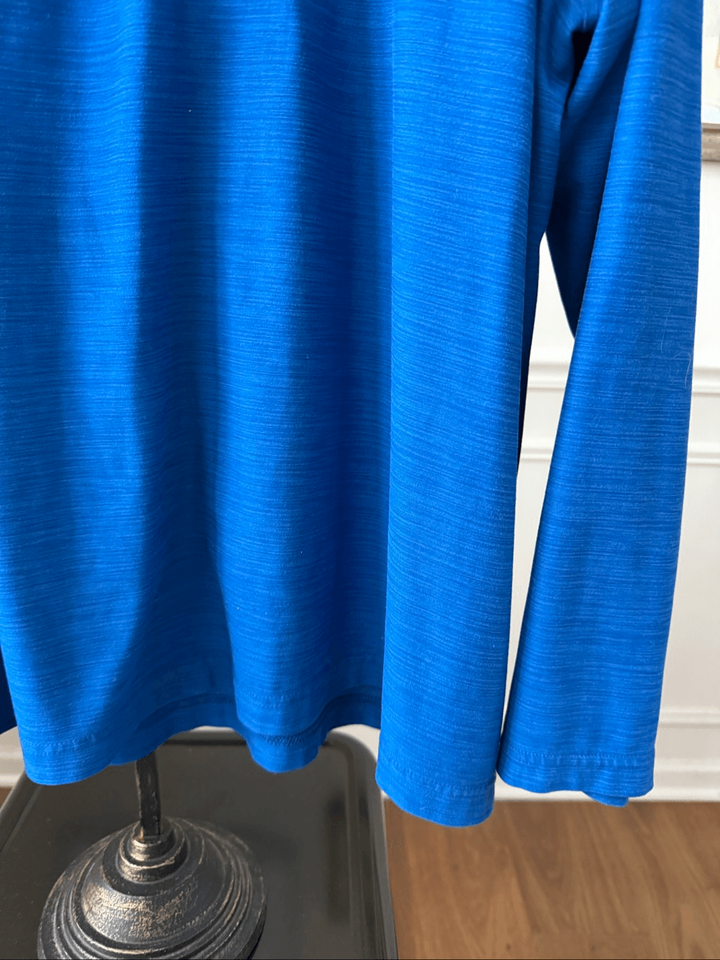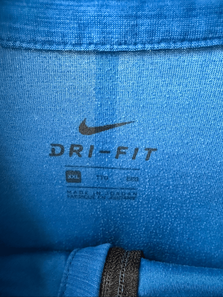 Cobalt blue with Nike swoosh at the chest and dry fit at the hip. Lightweight and moisture wicking. Tag size XXL. Laying flat measures 27.5? shoulder to hem and 25? armpit to armpit.