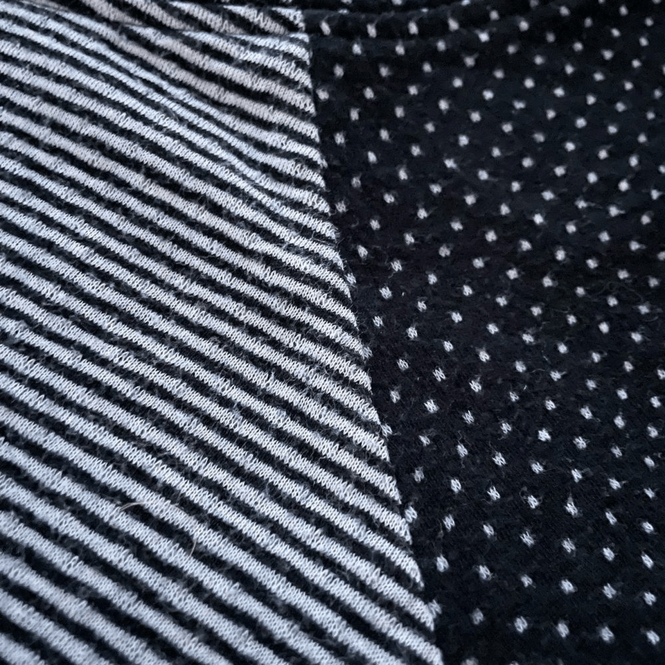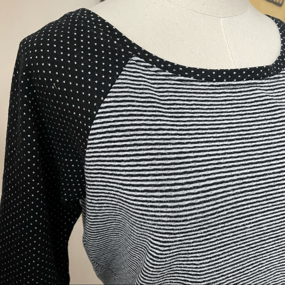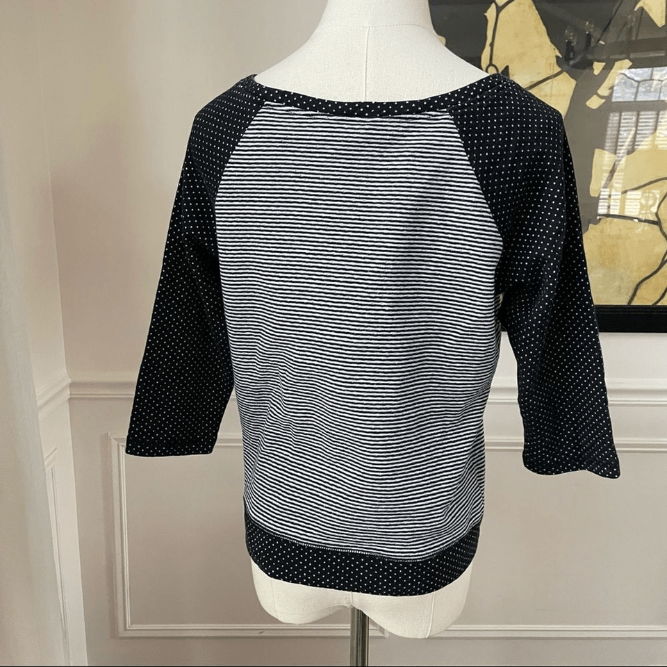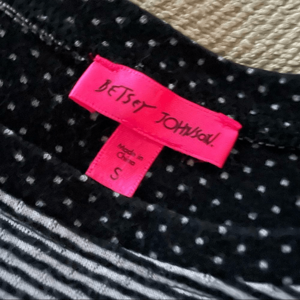 Betsy Johnson black stripe and polkadot slightly cropped top made of a polyester and cotton blend. 20.5 inches from shoulder to hem and 18.5 inches from armpit to armpit