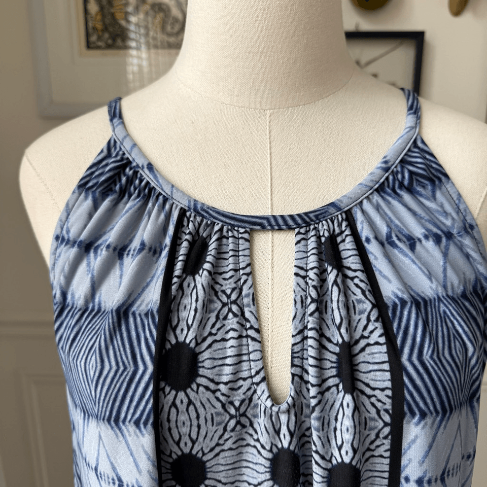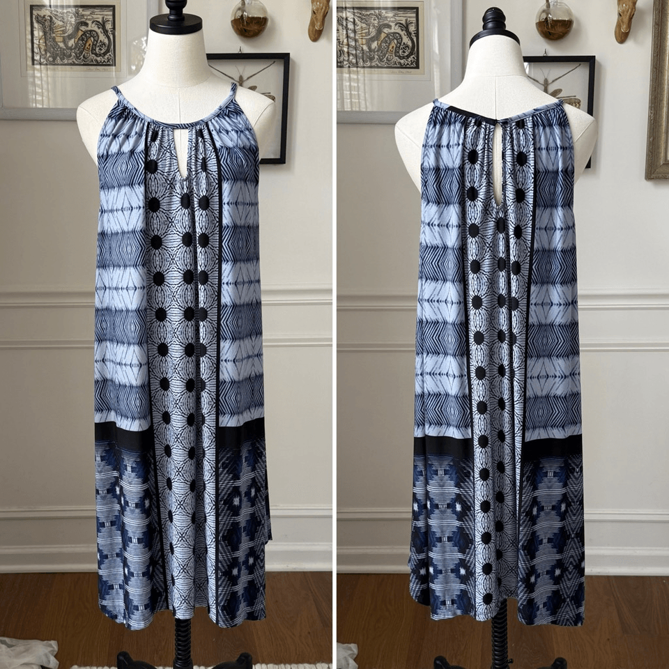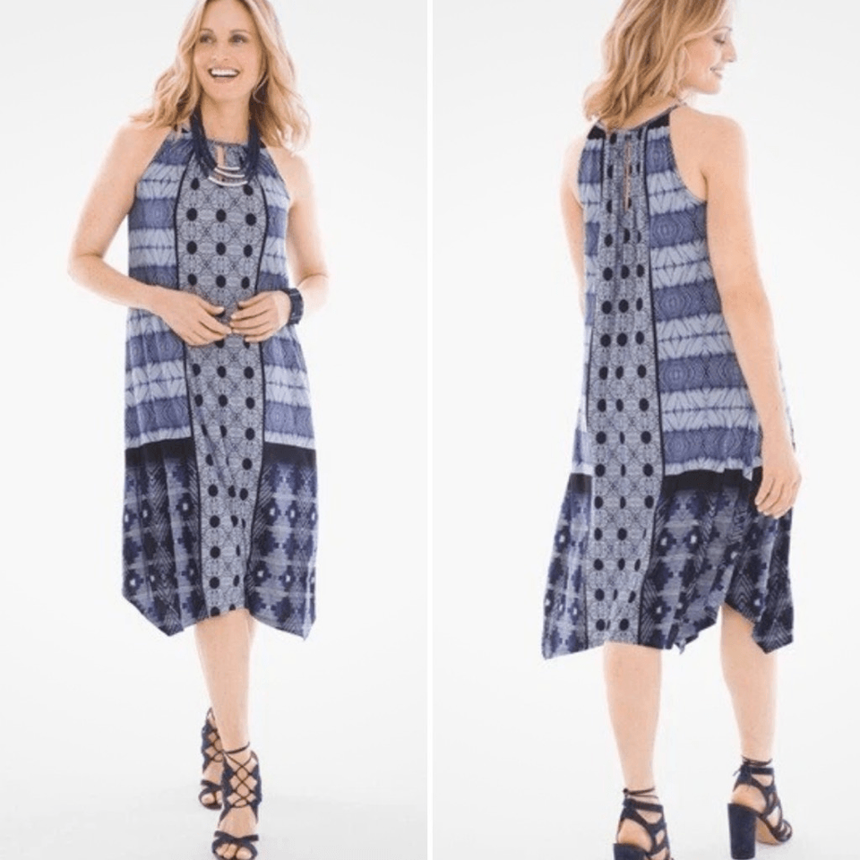 Chico?s indigo blue boutique, print trapeze or swing dress with keyhole front. Stretchy polyester and spandex jersey fabric. Tag size 3, which in Chico?s proprietary sizing is roughly equivalent to a US size XL. Laying flat measures 23 inches armpit two armpit, 26 inches straight across the waist and 40 inches shoulder to hem.