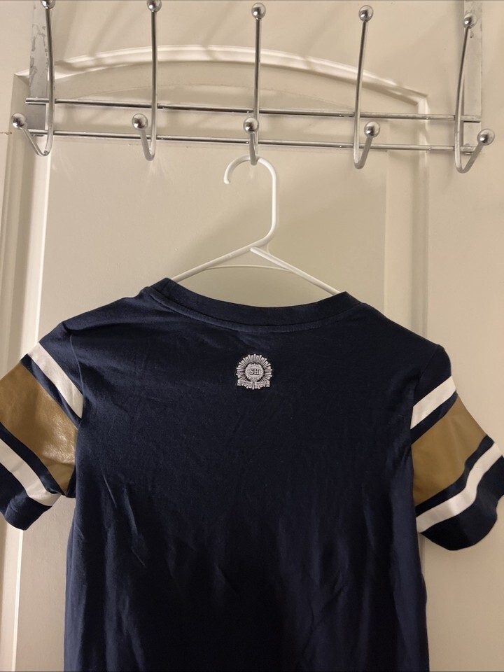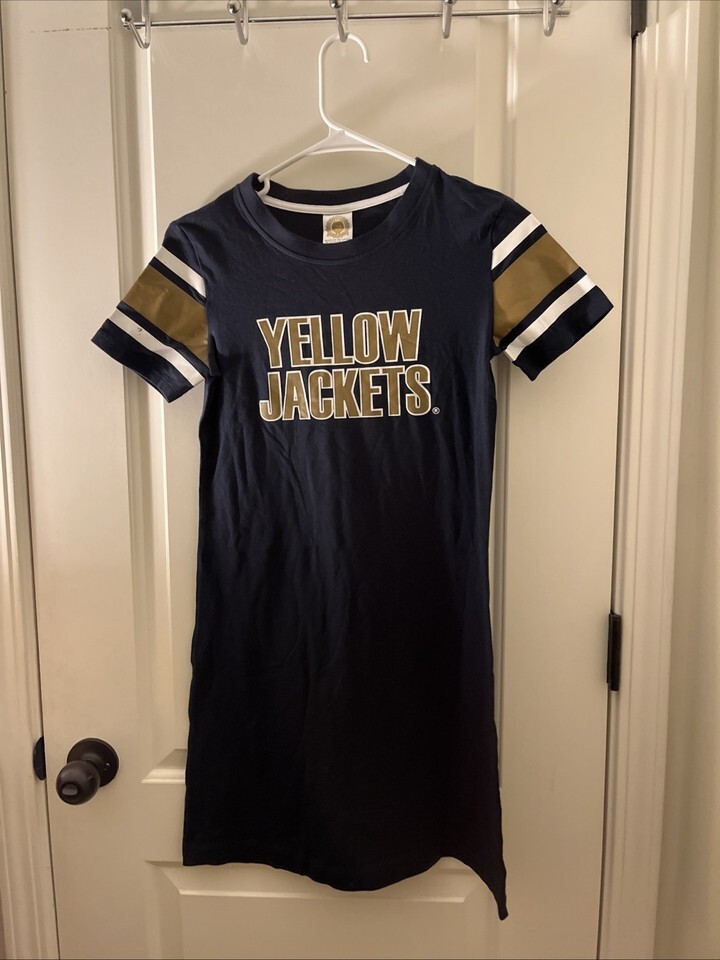 Georgia Tech Yellow Jackets Women's T-Shirt Mini Dress Slim Fit Pick Your Size Multi-Color in good condition. The is some cracking and peeled off areas as well as a few stains in areas. This can be worn as a long length t-short or as a mini dress for a shorts woman.