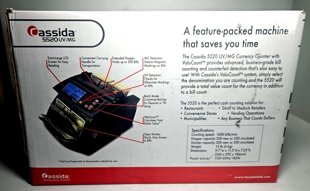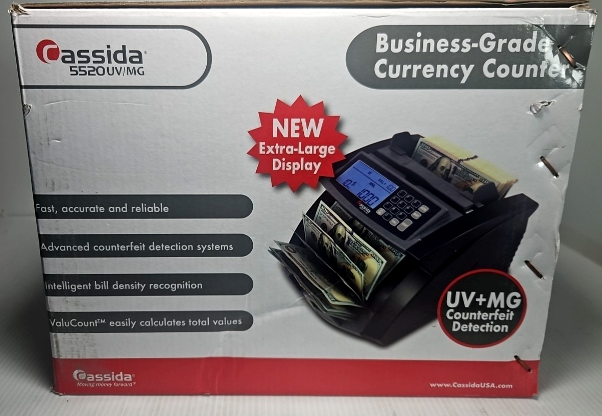 Cassida 5520 UV/MG business-grade currency counter with high-speed counting and advanced counterfeit detection. Designed for retail, restaurants, offices, and any business handling cash. Features an extra-large LCD display and ValuCount? technology to calculate total bill value by denomination.