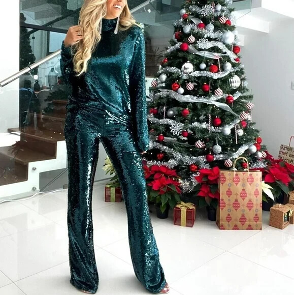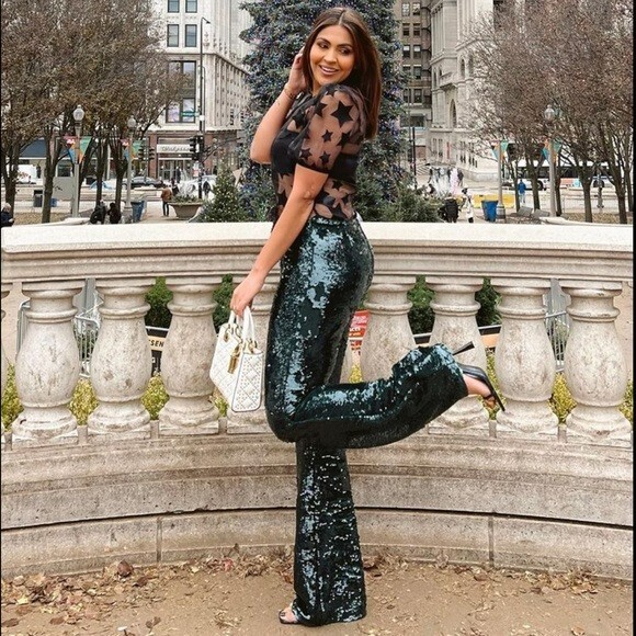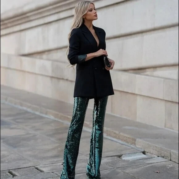 NWT ZARA CHRISTMAS DARK GREEN FLARED SEQUIN PANTS XS