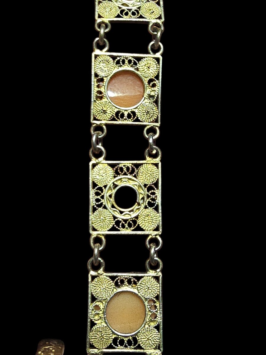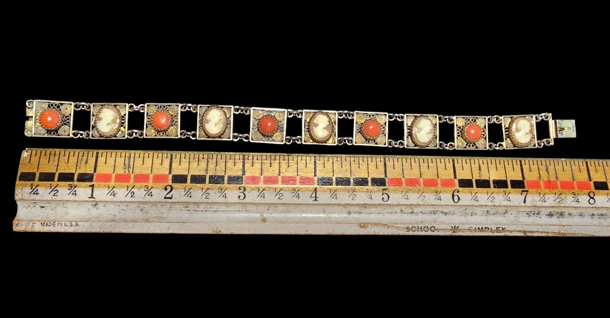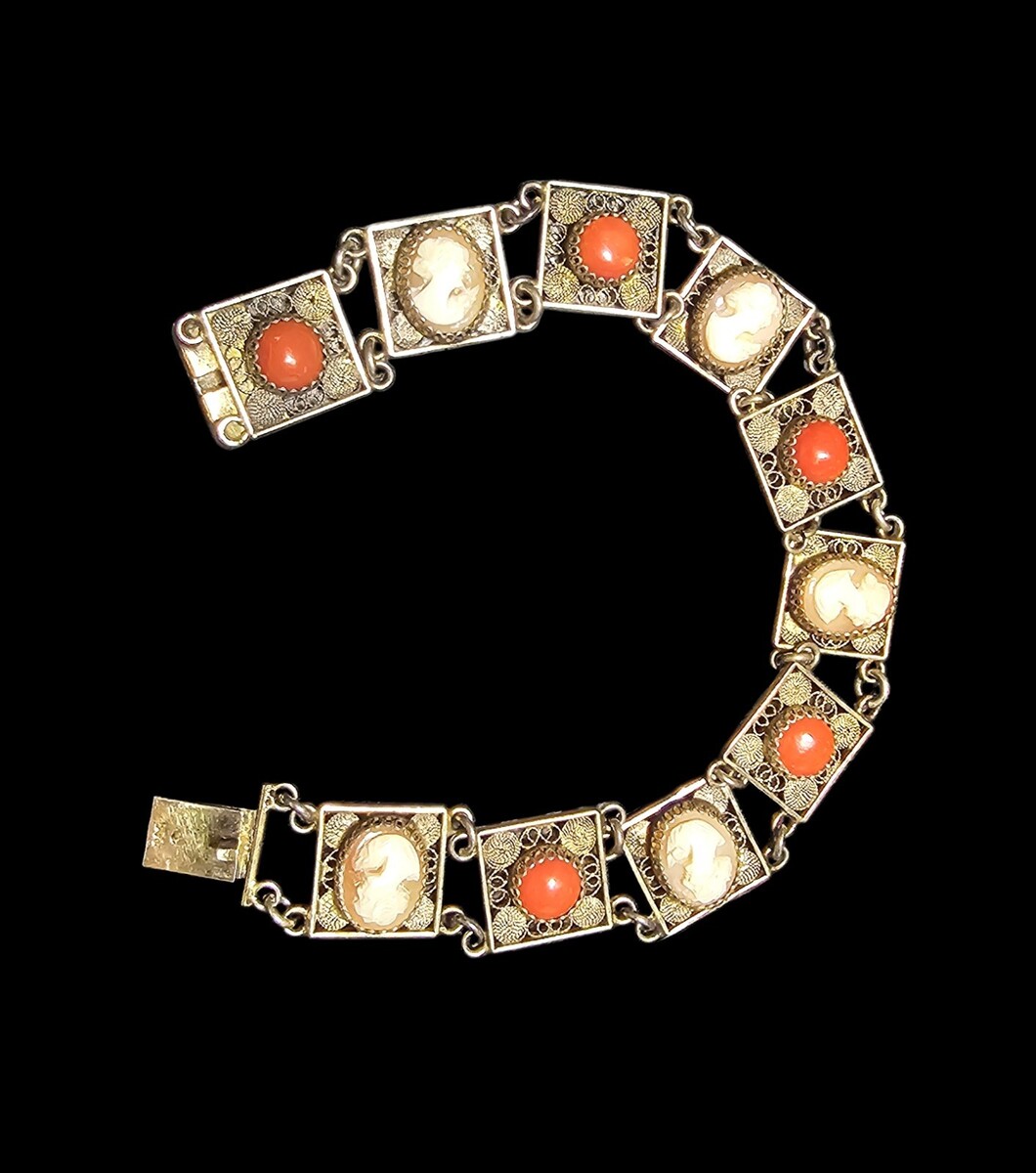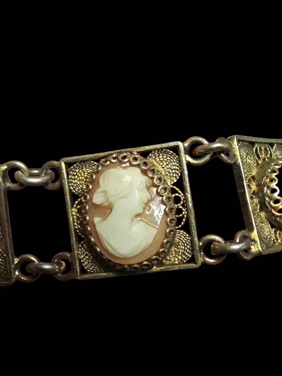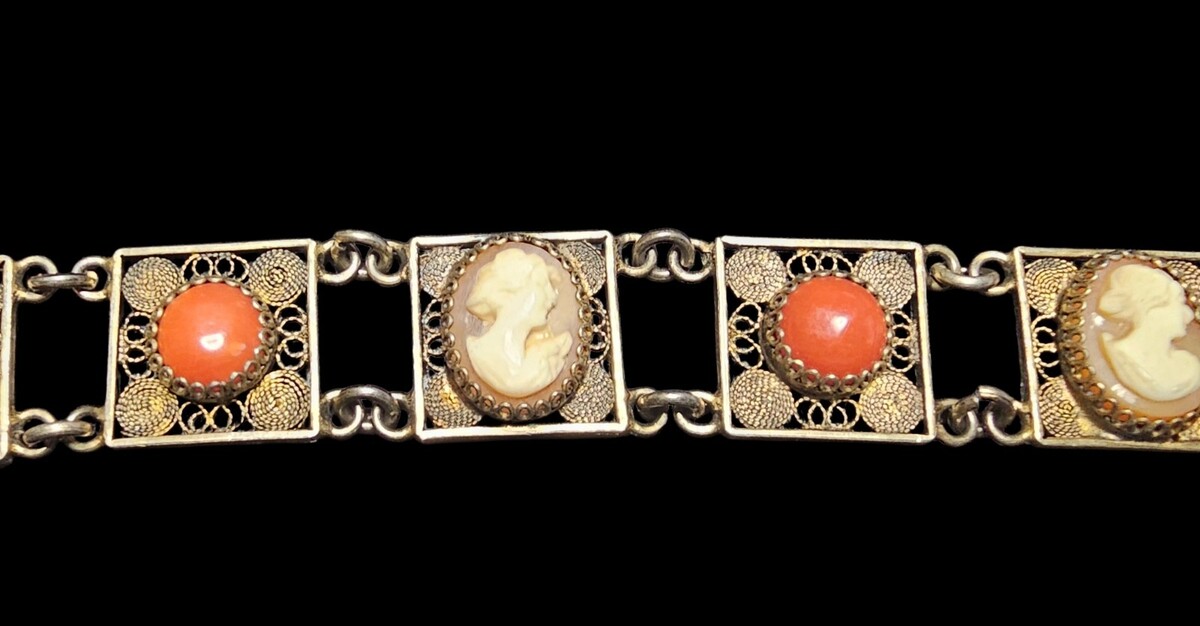 This is a substantial, well-balanced bracelet with strong visual presence and craftsmanship that clearly separates it from later reproductions or costume pieces. Fine Italian filigree bracelets with original cameos and coral elements are increasingly difficult to find, particularly in such complete and cohesive condition.