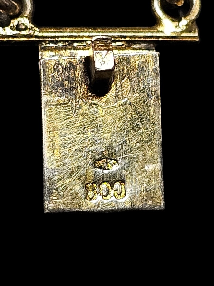 The bracelet is stamped 800, confirming Italian silver content, and retains its original box clasp, which functions smoothly and closes securely. Surface wear and gentle patina are consistent with age and enhance the visual depth of the gilded finish without detracting from the overall presentation. There are no missing panels, no structural issues, and all stones are intact and well set.