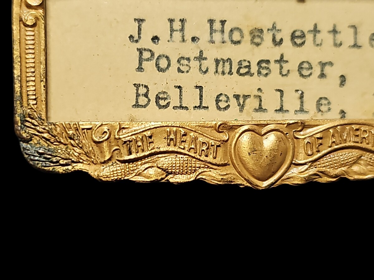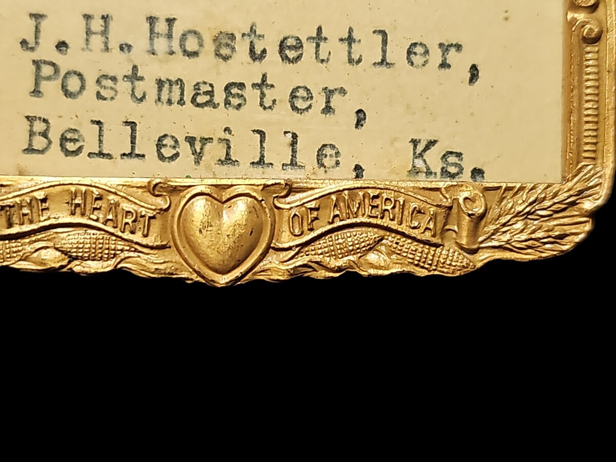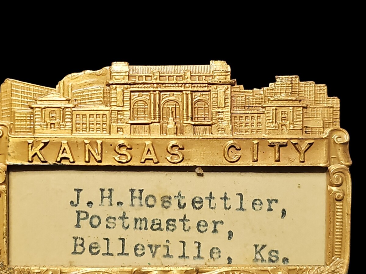 This vintage metal name badge identifies J. H. Hostettler, Postmaster of Belleville, Kansas, and features the iconic ?Kansas City ? The Heart of America? motif across the top. The badge is richly detailed with raised architectural imagery and a decorative border, reflecting early-to-mid 20th century civic and postal presentation styles.